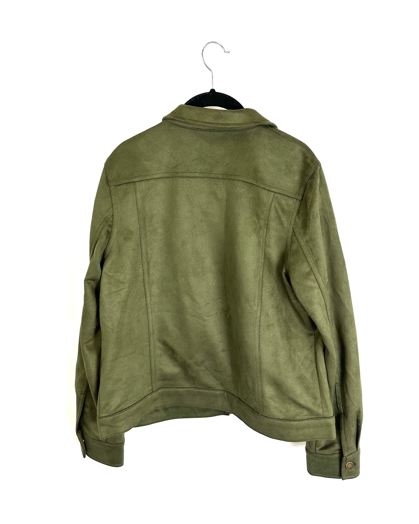 Belle by Kim Gravel jacket with long sleeves, slightly cropped, 2 front panel pockets with buttons, 2 side pockets, and a collared neckline in a soft, green suede-like material.