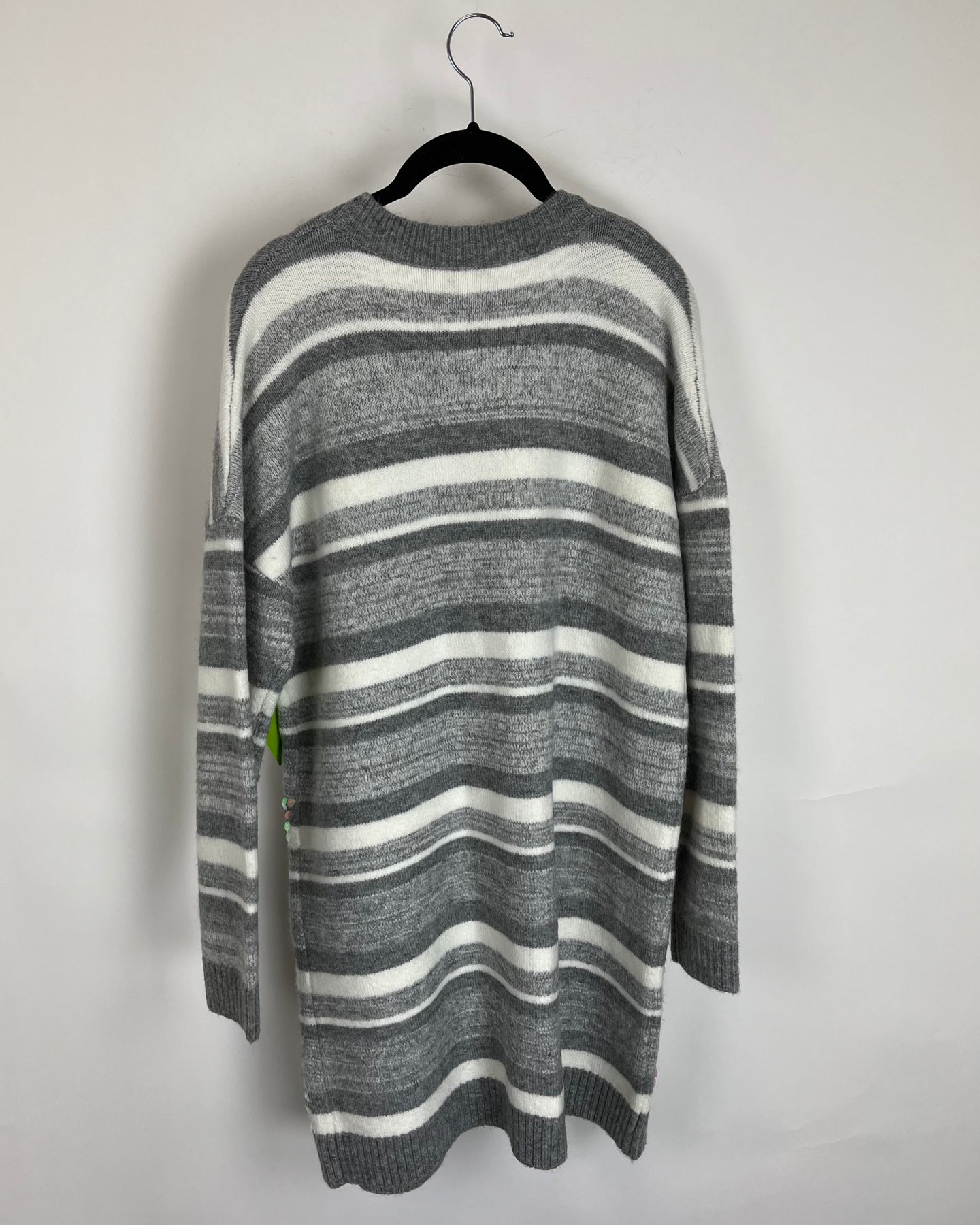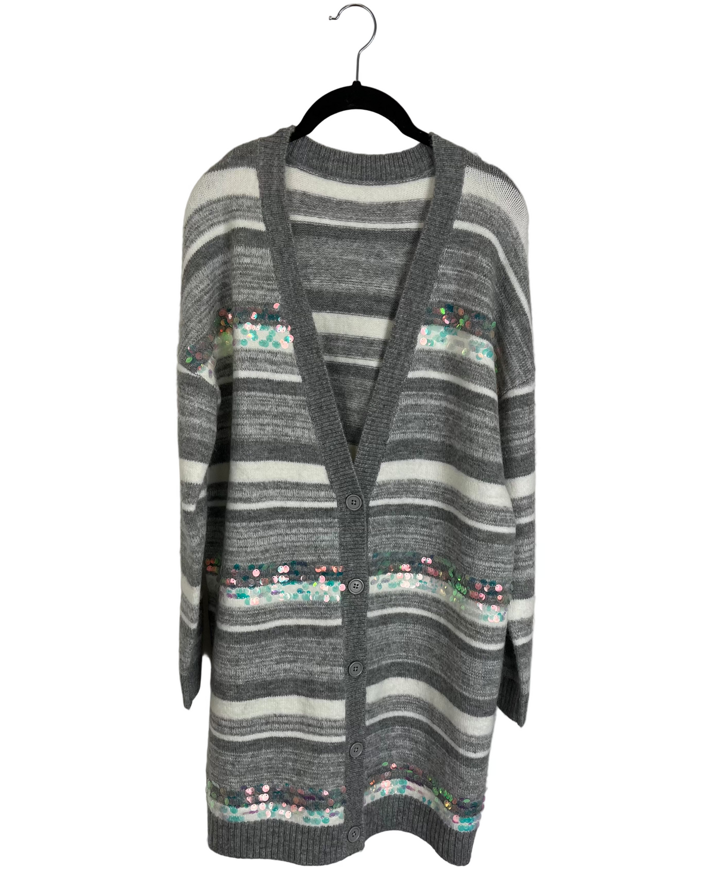 Reunited grey and white stripped cardigan with v-neckline and holographic sequin details