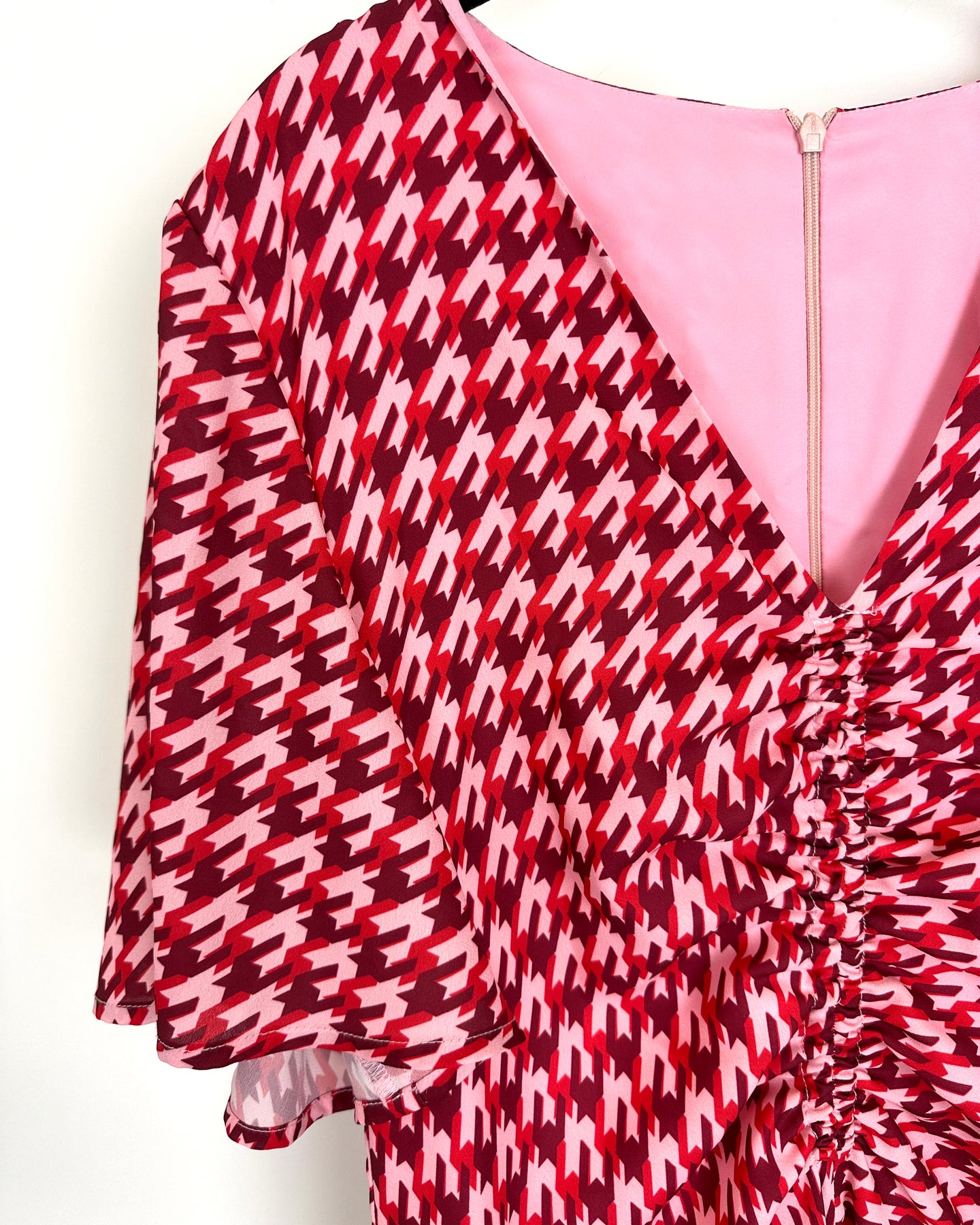 Reunited red, pink, and burgundy houndstooth print v-neck dress with short, flowy sleeves and back zipper