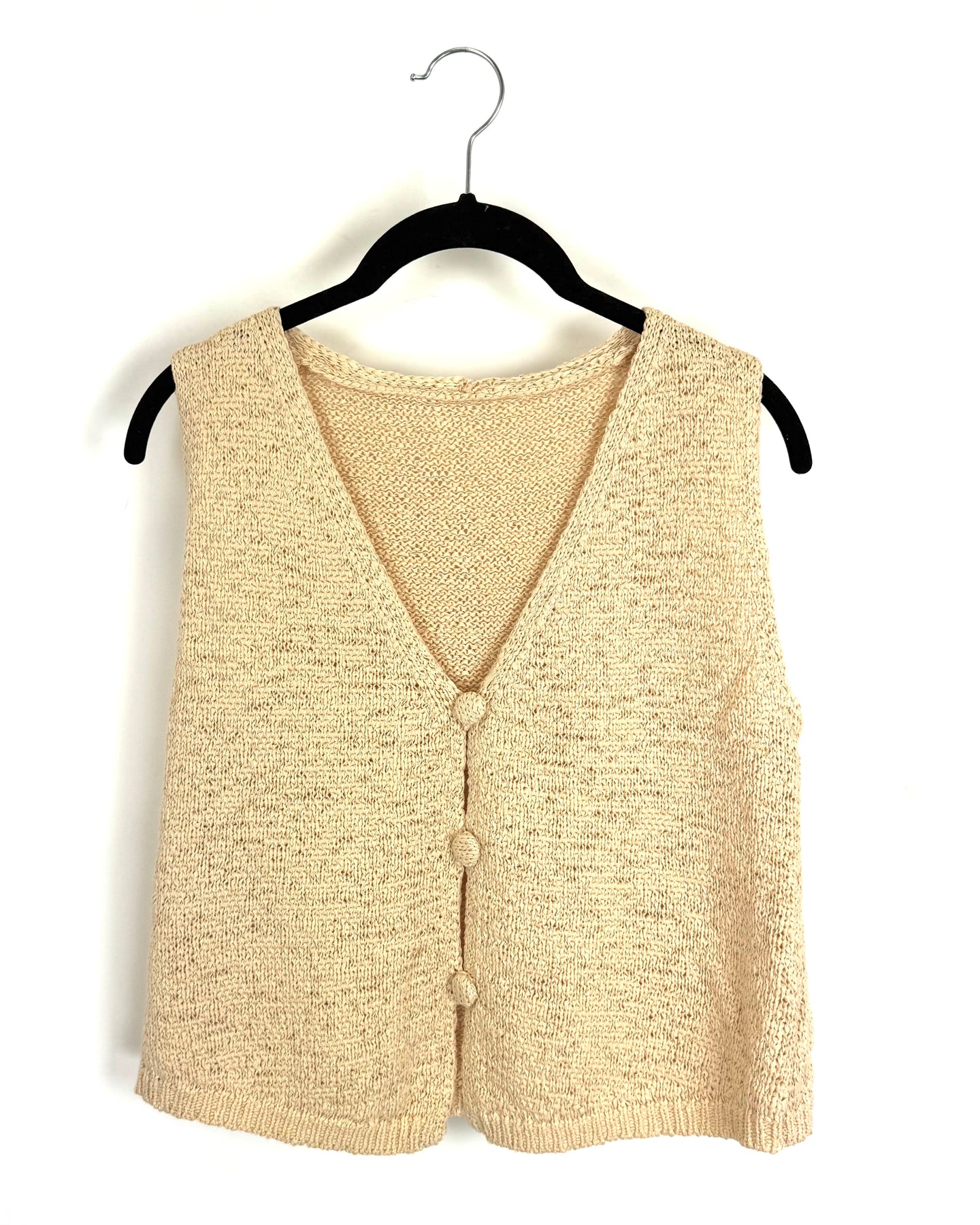Reunited tan sweater vest in a knit, textured material with a V-neckline, a ribbed trim along the bottom, and tan knit buttons on the front