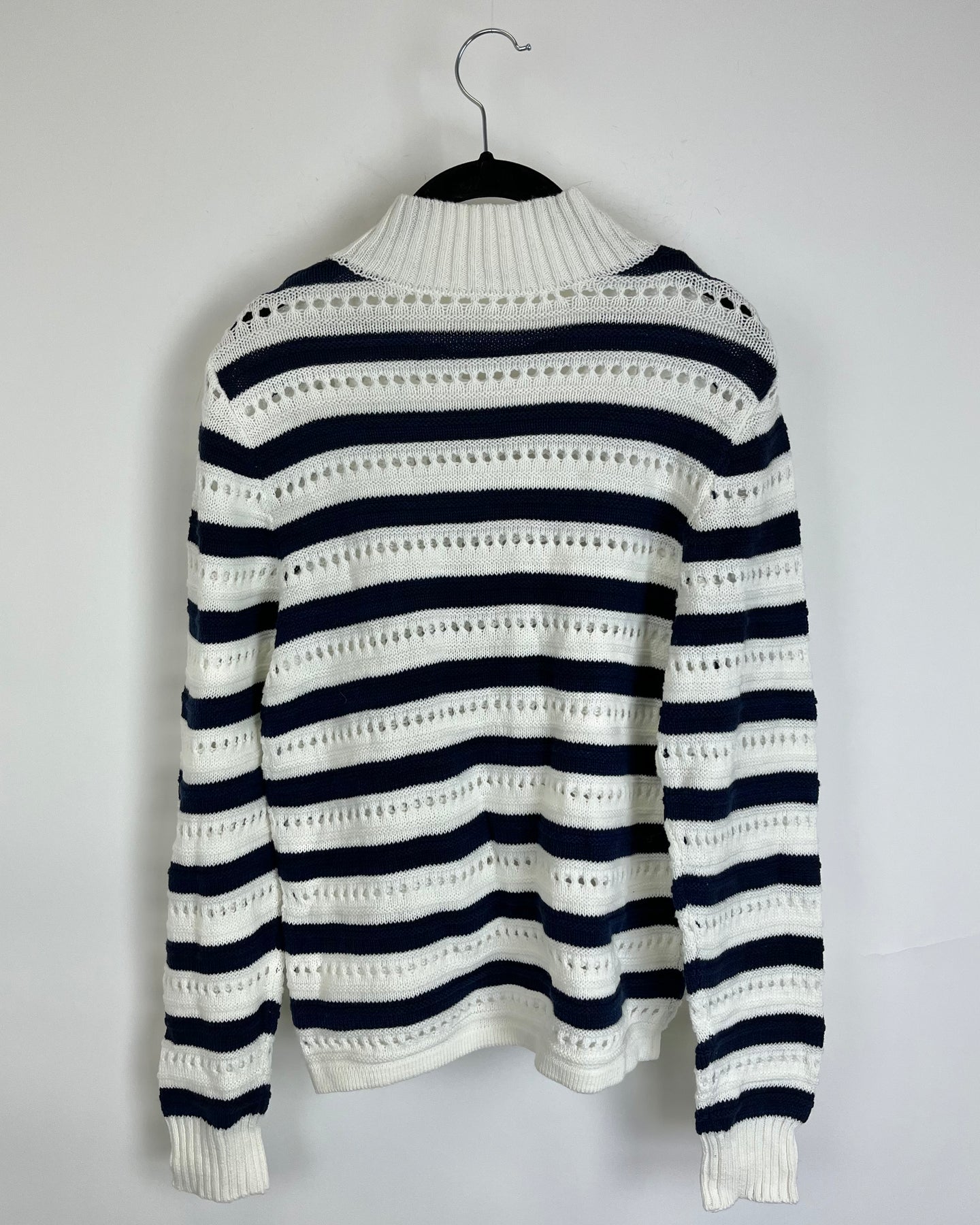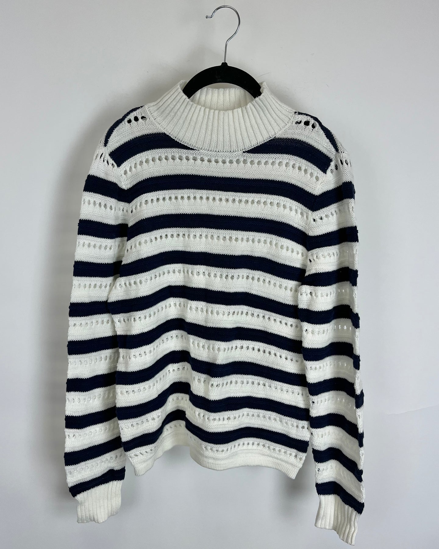 Reunited white and navy striped mock-neck pull-over sweater, with eyelit crochet pattern, cuffed sleeves, very warm and cozy and lightweight