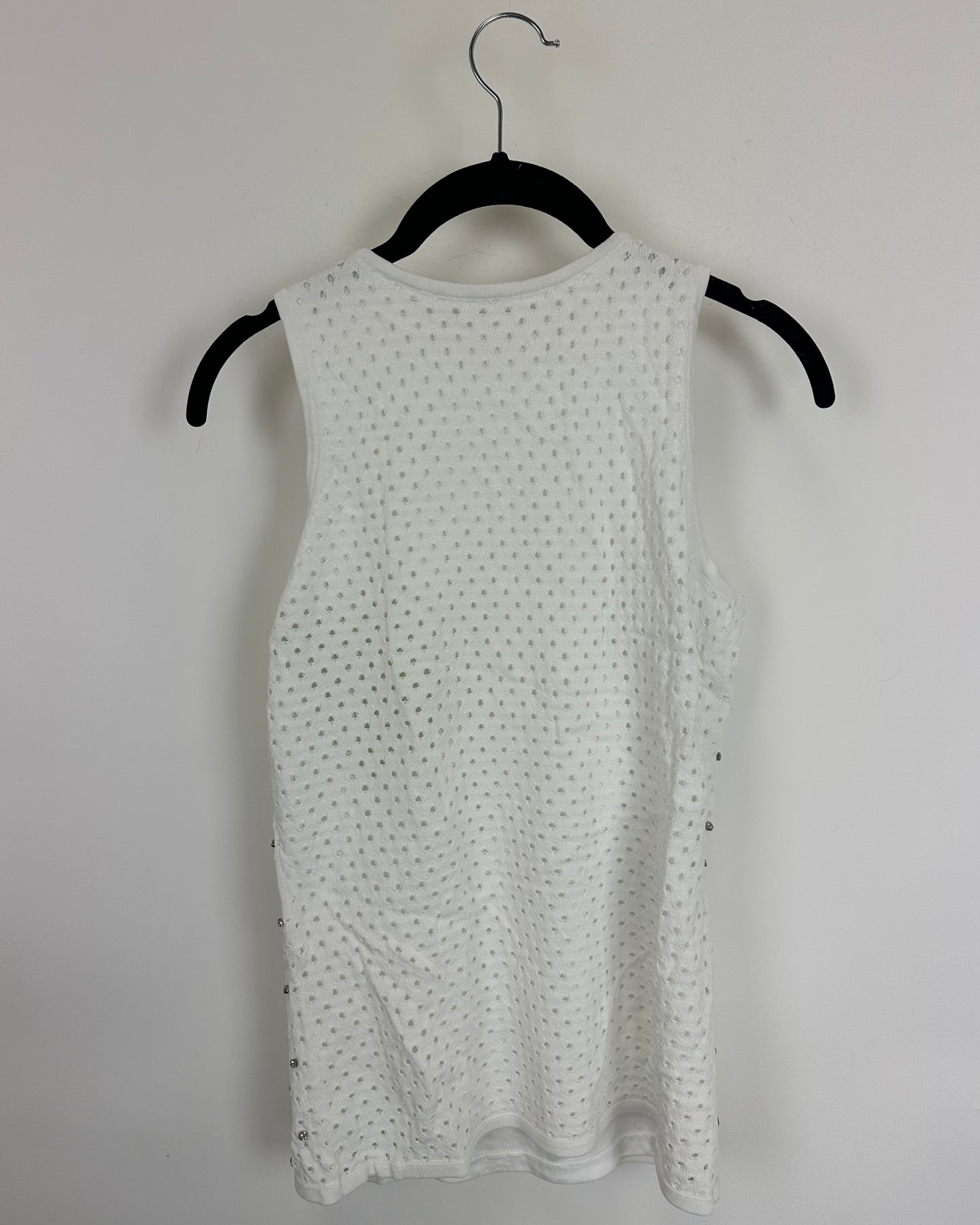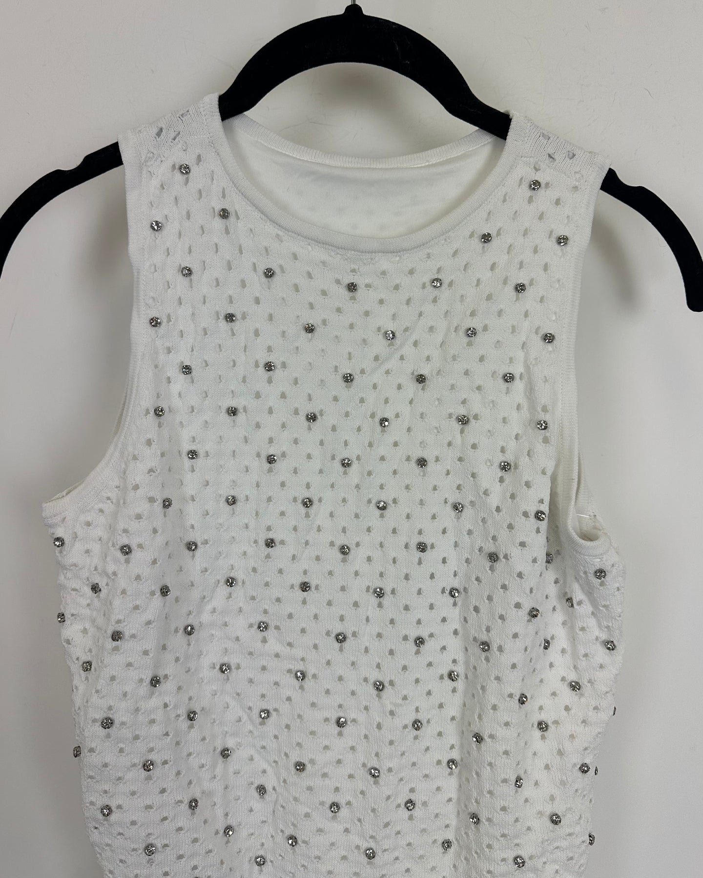 Reunited white tank top with distressed hole overlay with silver rhinestone embellishments and crew neckline