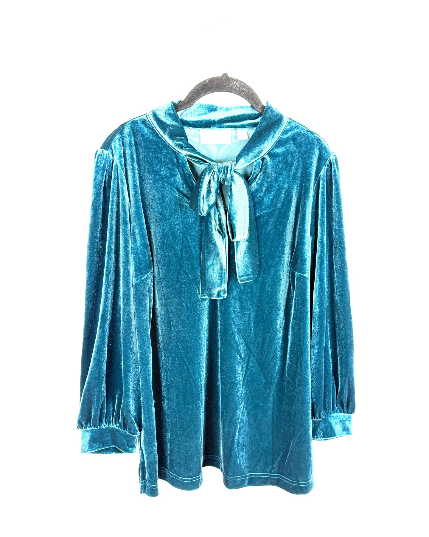 Belle by Kim Gravel dark cyan top with soft velour fabric, featuring long balloon sleeves, a tie neckline, and comfortable stretch.