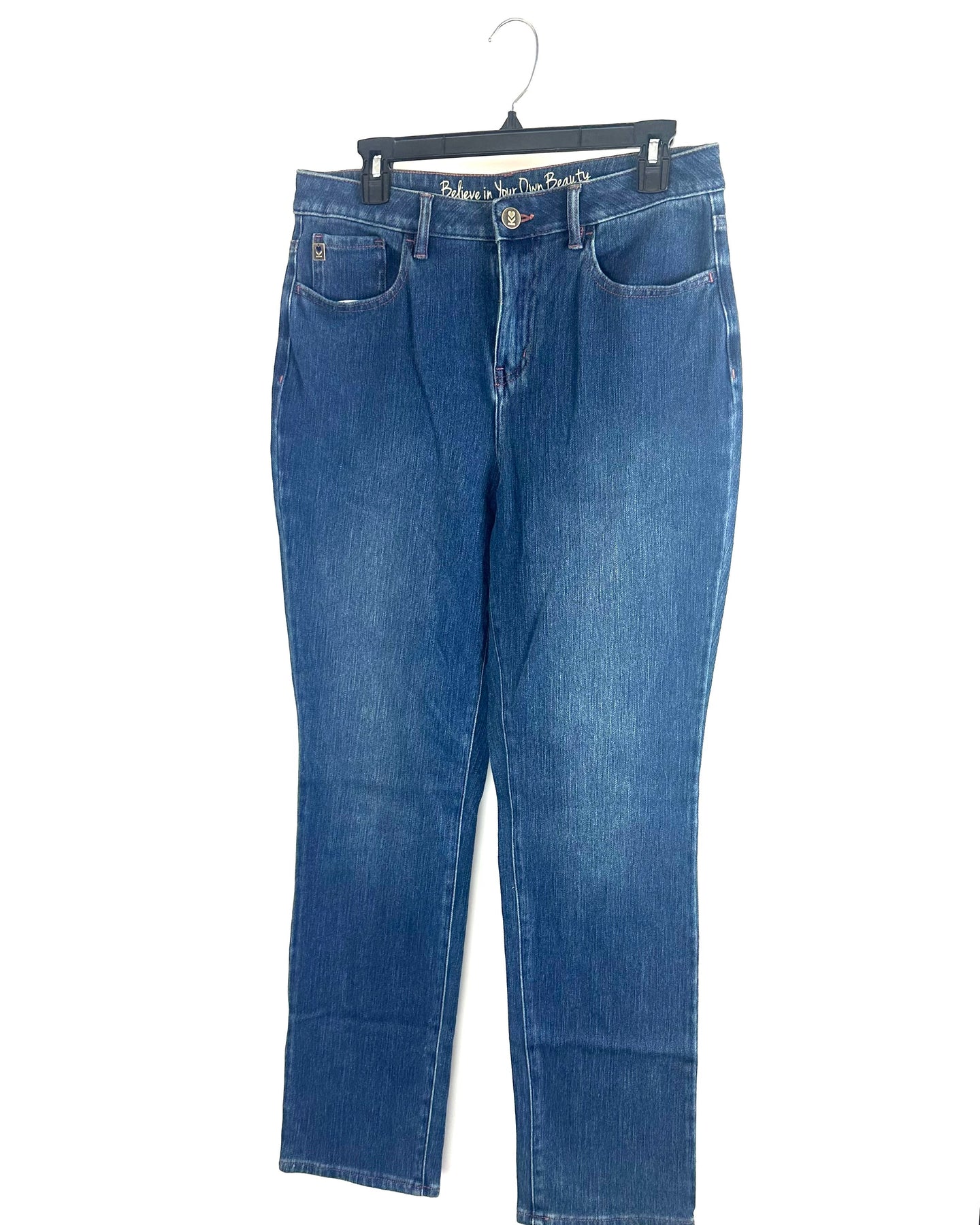 Belle by Kim Gravel navy blue wash jeans with front button and hidden zipper closure, front slash and back pockets and belt loops
