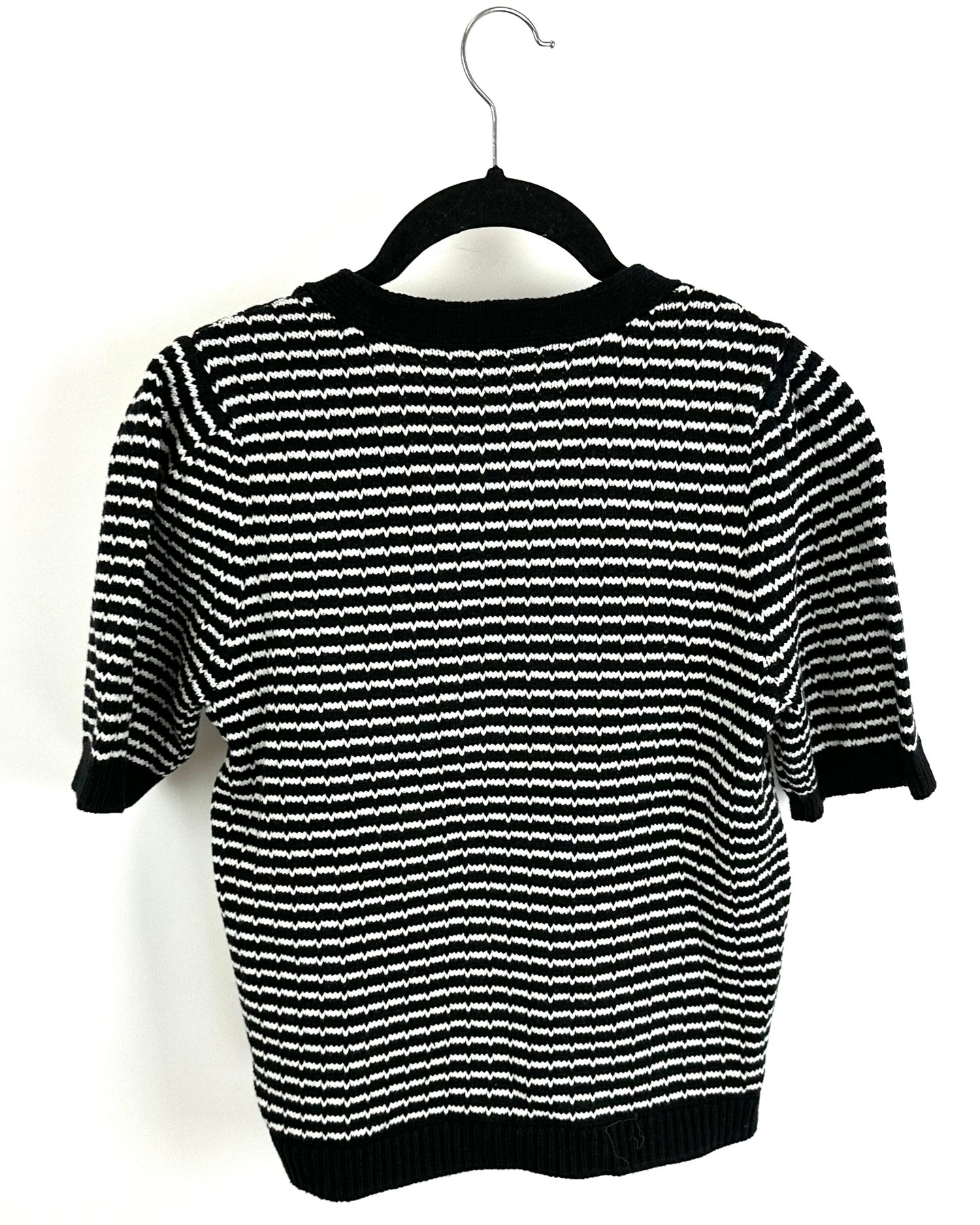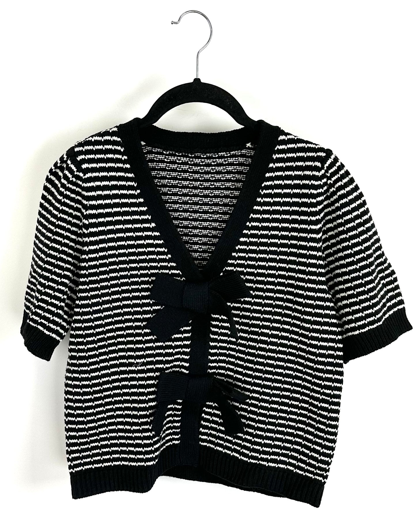 Reunited Clothing sweater top in a knit material with a black and white striped pattern, short sleeves, a V-neckline, a black solid trim along all the edges, two black bow details on the front, and two silver clasp buttons to close on the front