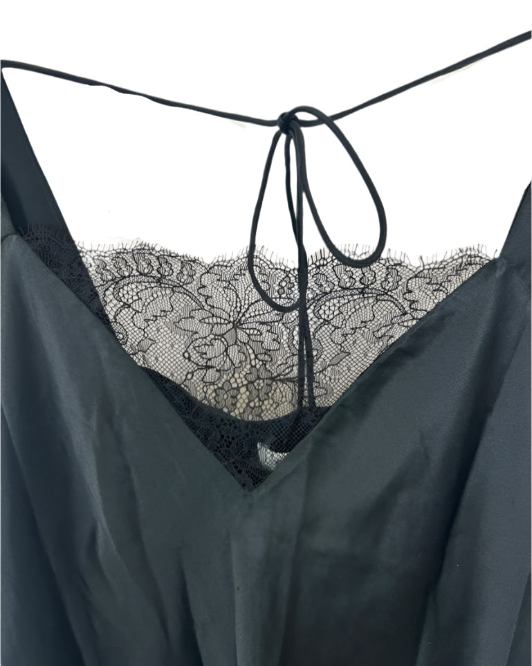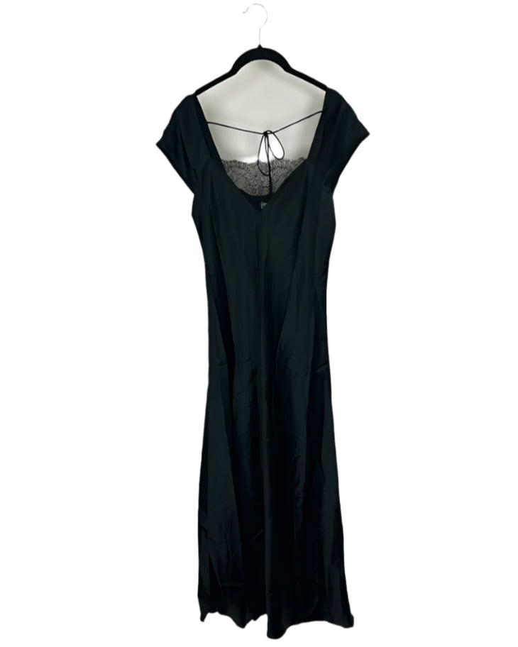 Cami NYC black cap sleeve dress with lace at neckline, bow tie at the top of back, and satin like feel.