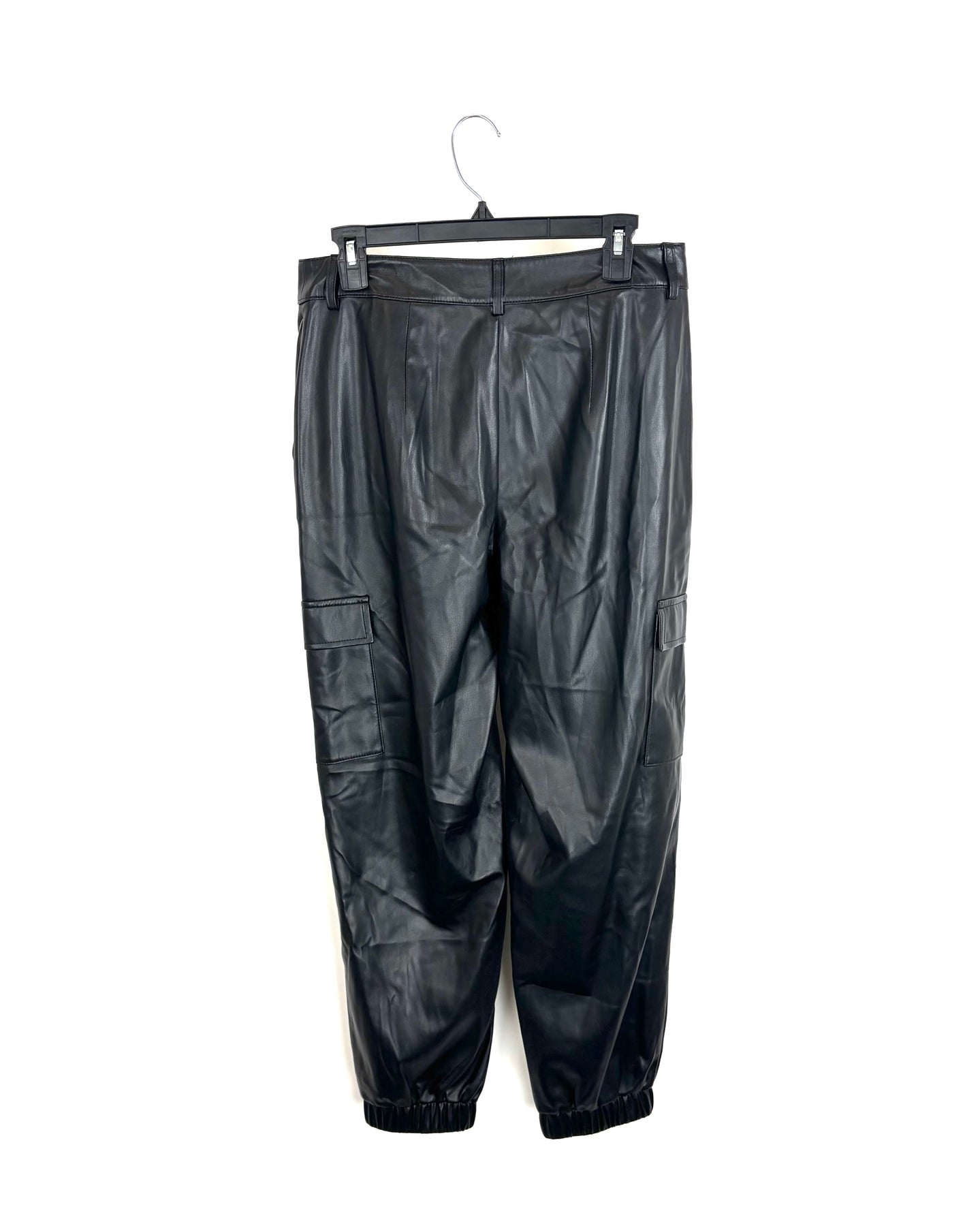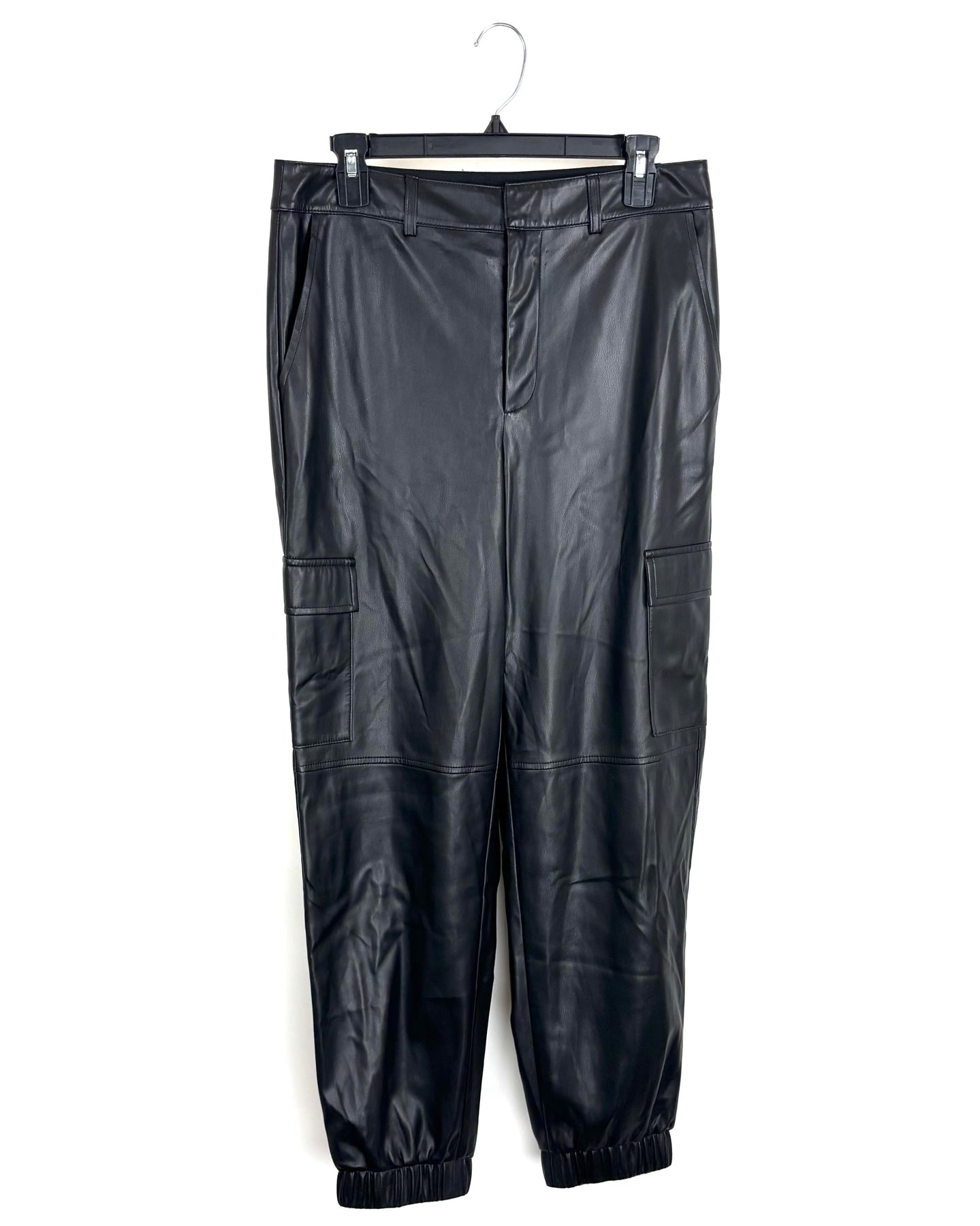 Reunited Clothing black faux leather joggers with a zipper & clasp closure, side pockets, cargo pockets, and cinched at the ankle.
