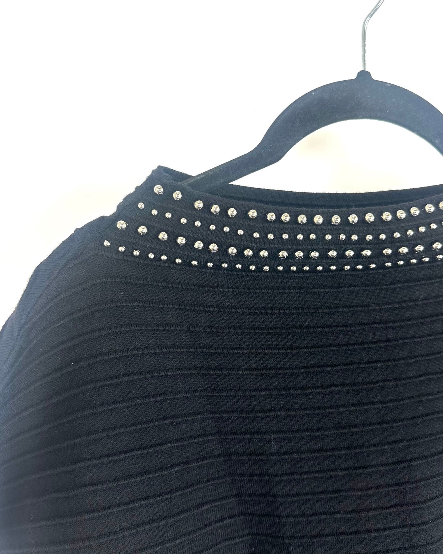 Black ribbed sweater with short sleeves and a studded detail on the neckline