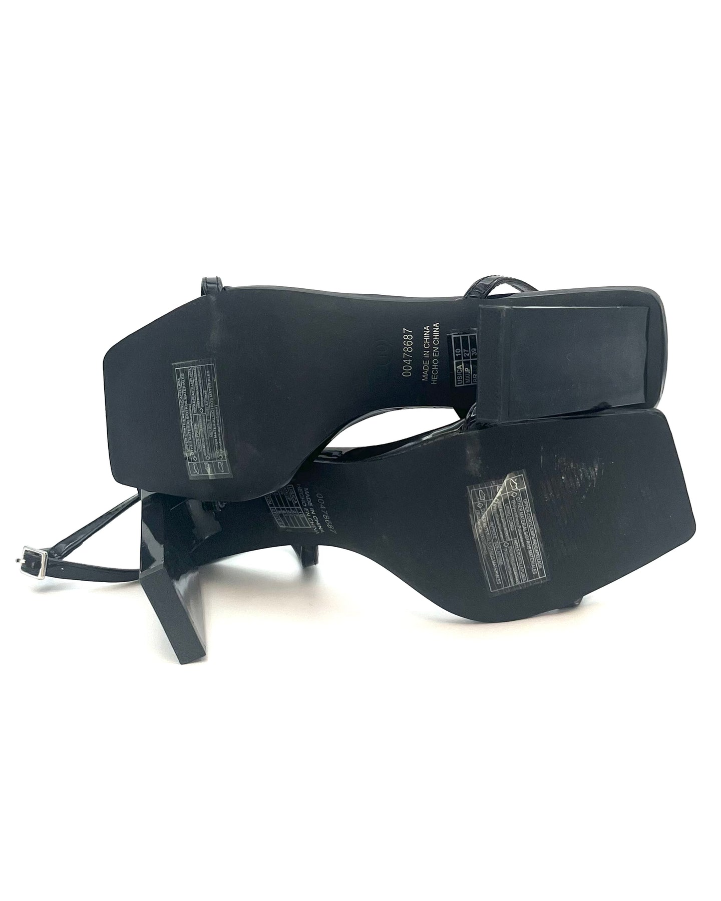 Forever 21 black faux patent leather pumps with a thin rectangular heel, thin toe strap, and an adjustable heel strap that wraps around the ankle