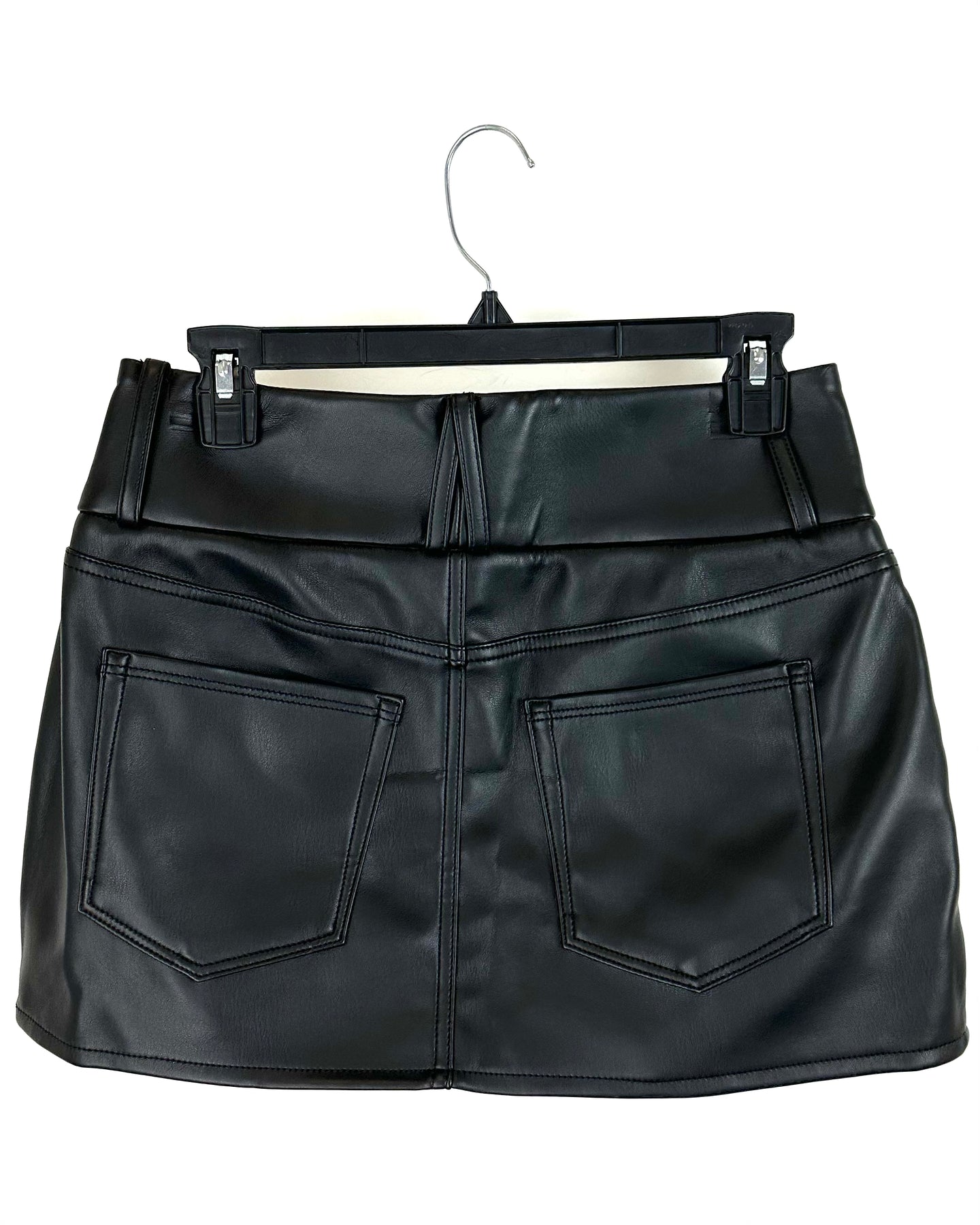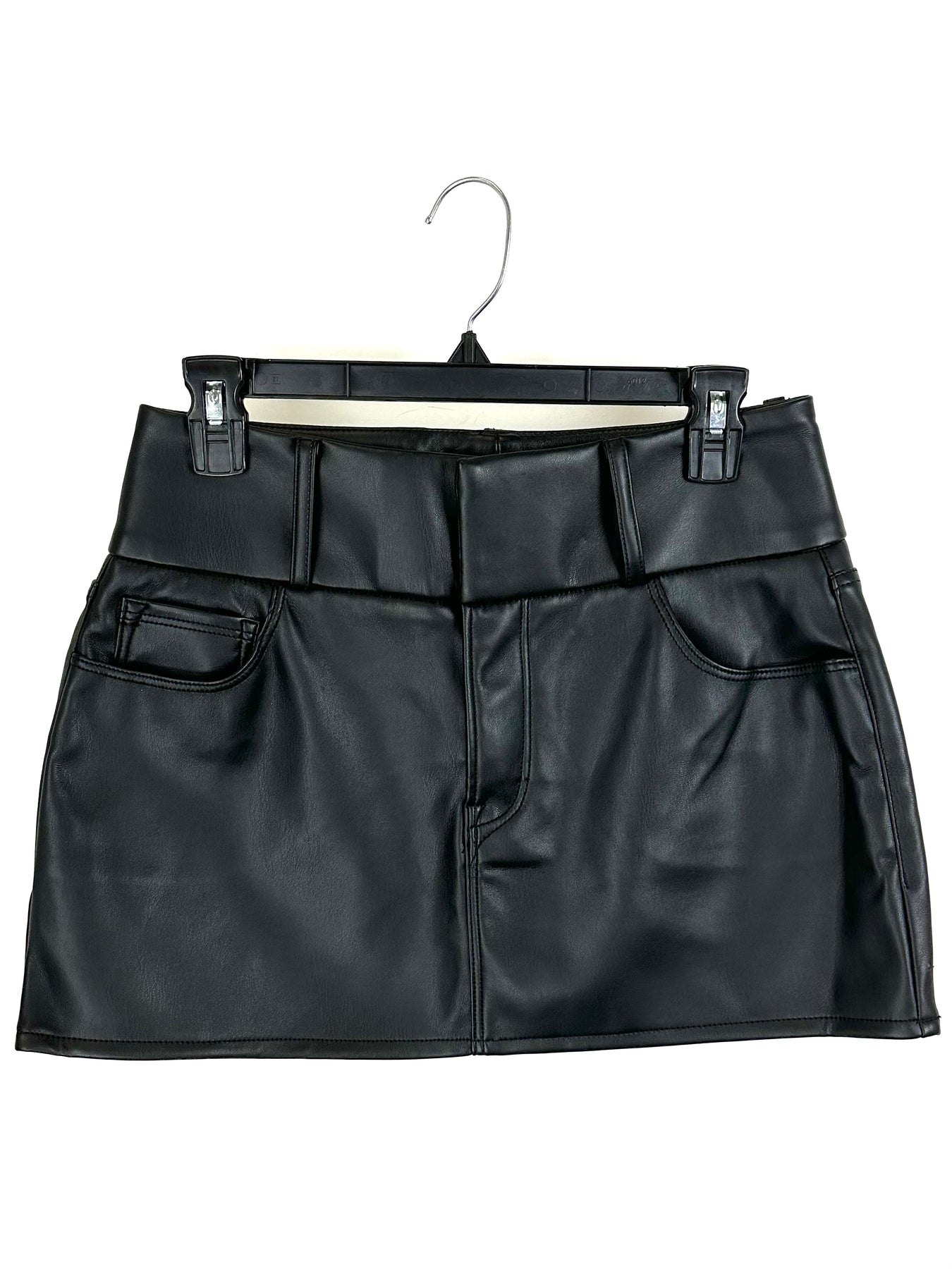 Good American black faux leather high rise mini skirt with hidden hook and eye waist closure and hidden front zipper closure, belt loops, front slash pockets and back pockets