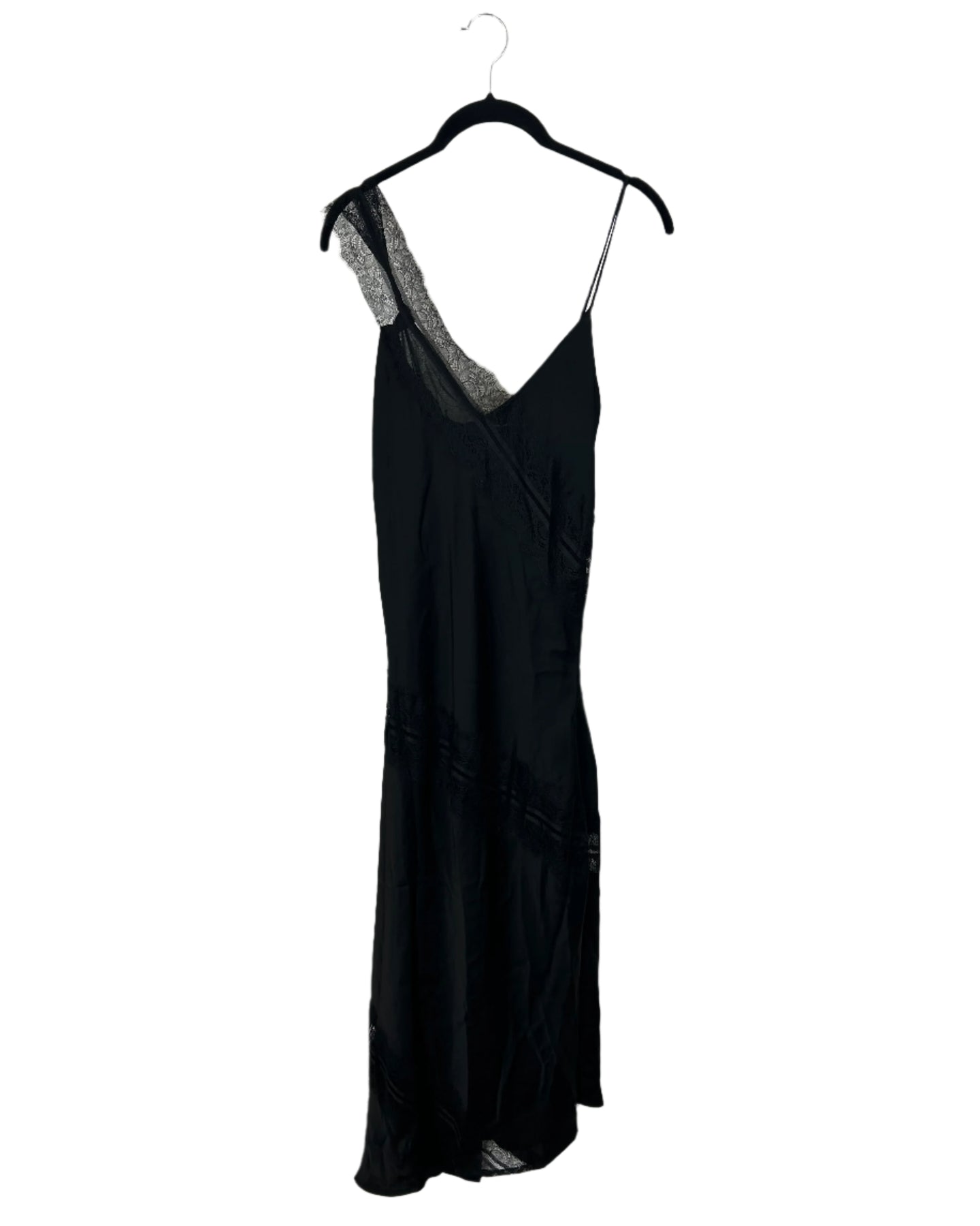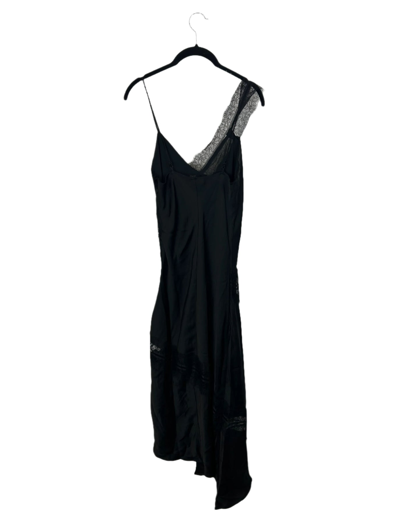 House Of Harlow asymmetrical black lace slip dress with a lace trim across bodice and hem, V-neckline, thin adjustable straps and a zipper down side, made with a silk like fabric