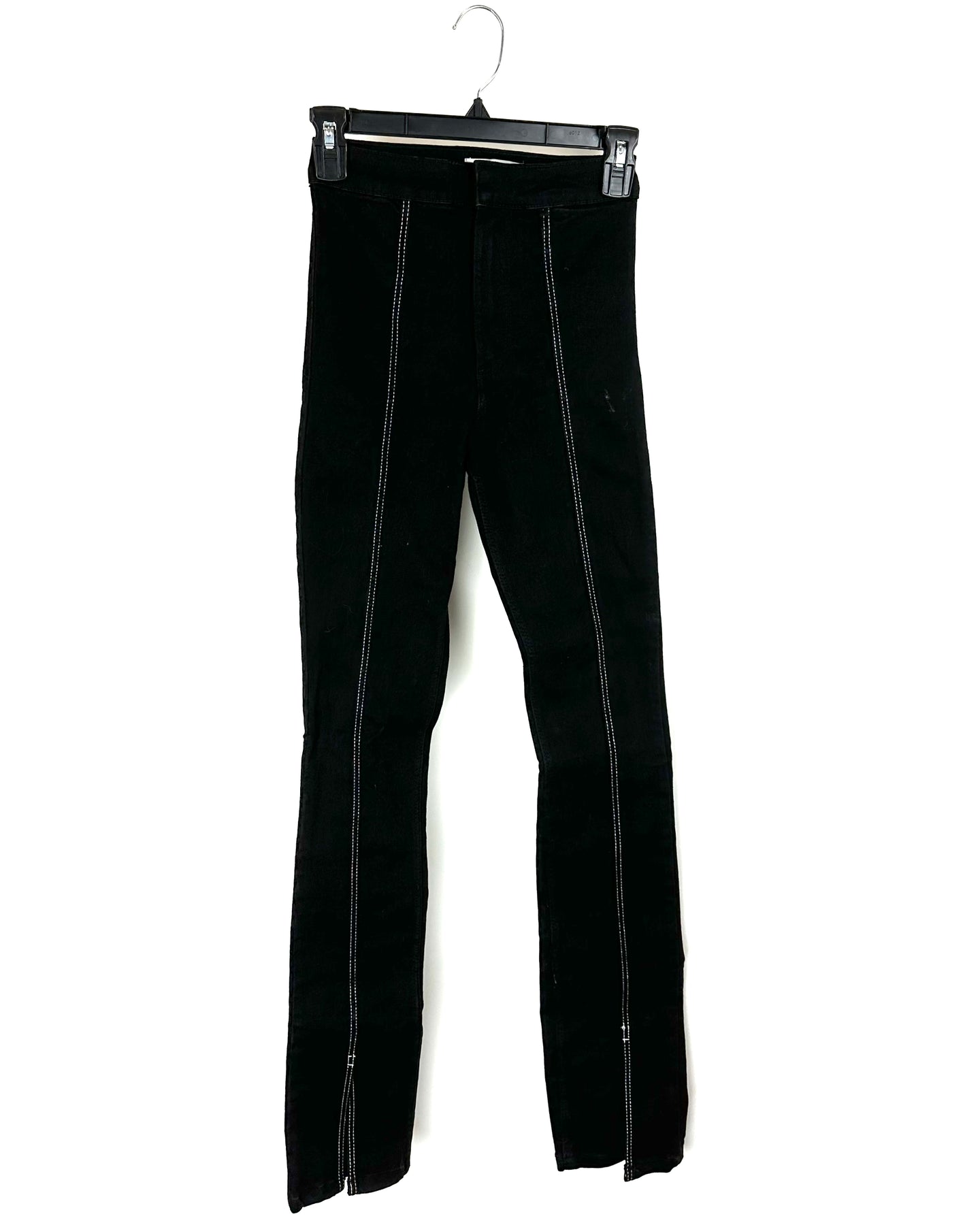 Zara high-waisted black straight-leg skinny jeans with white stitching detail, zipper and clasp closure, and slit detailing on the front bottom of the legs.