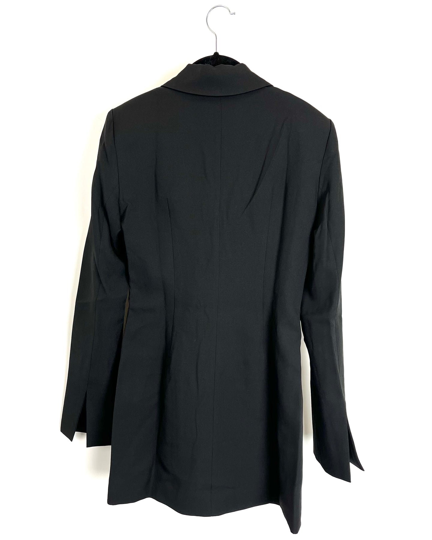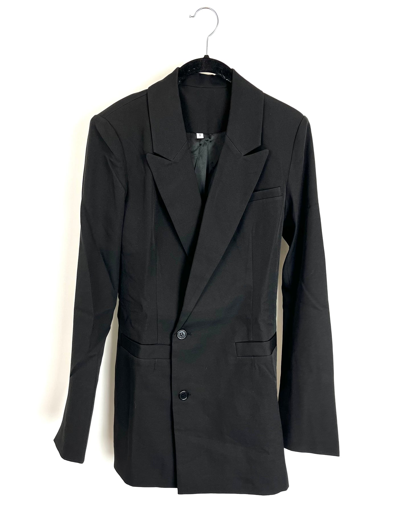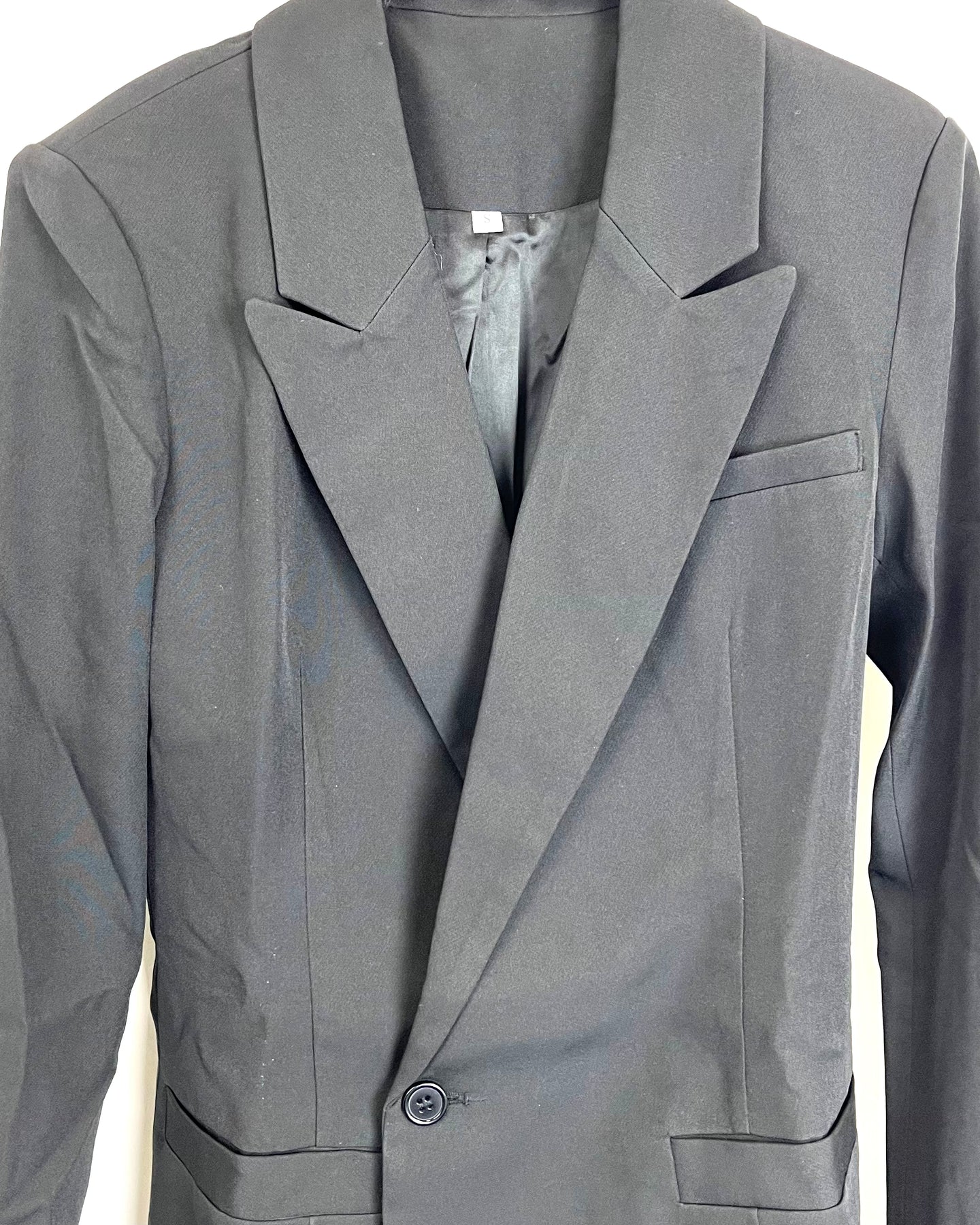 Black blazer with shoulder pads, front buttons, faux pockets and lapel collar