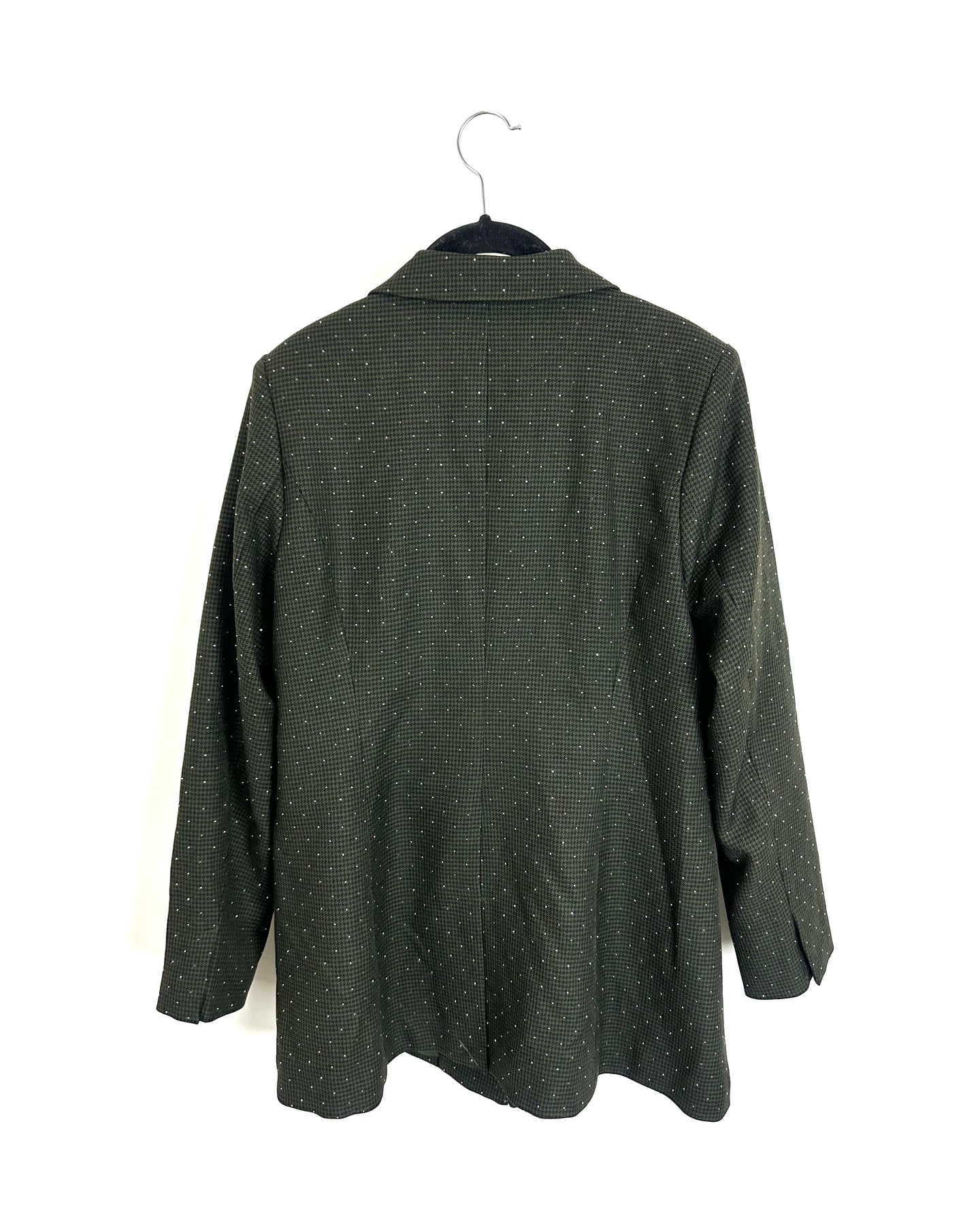 Belle by Kim Gravel blazer with long sleeves, slight shoulder pads, 2 front panel pockets, and singular button closure in a thick, black blazer material with speckled rhinestones.