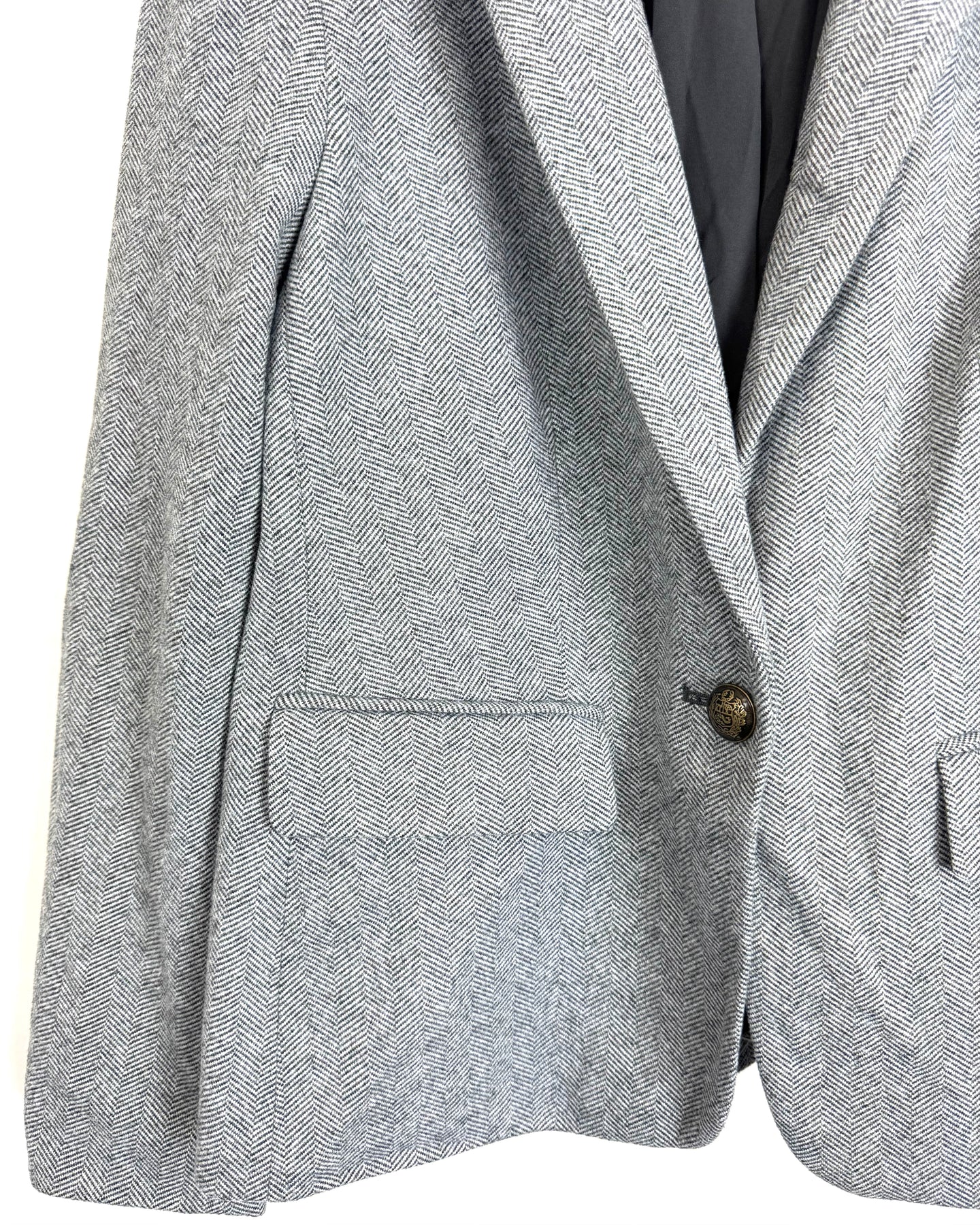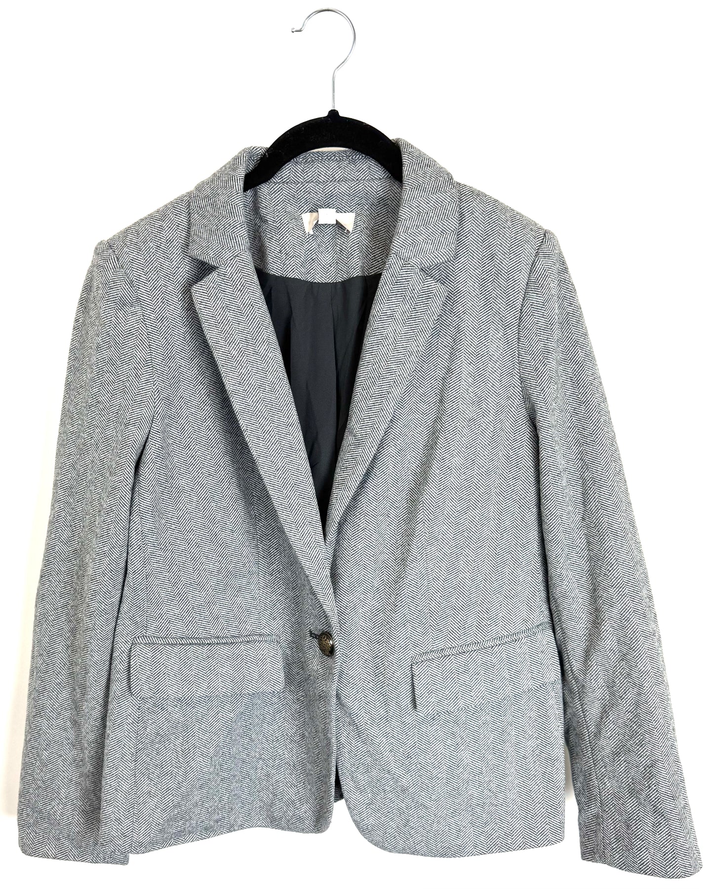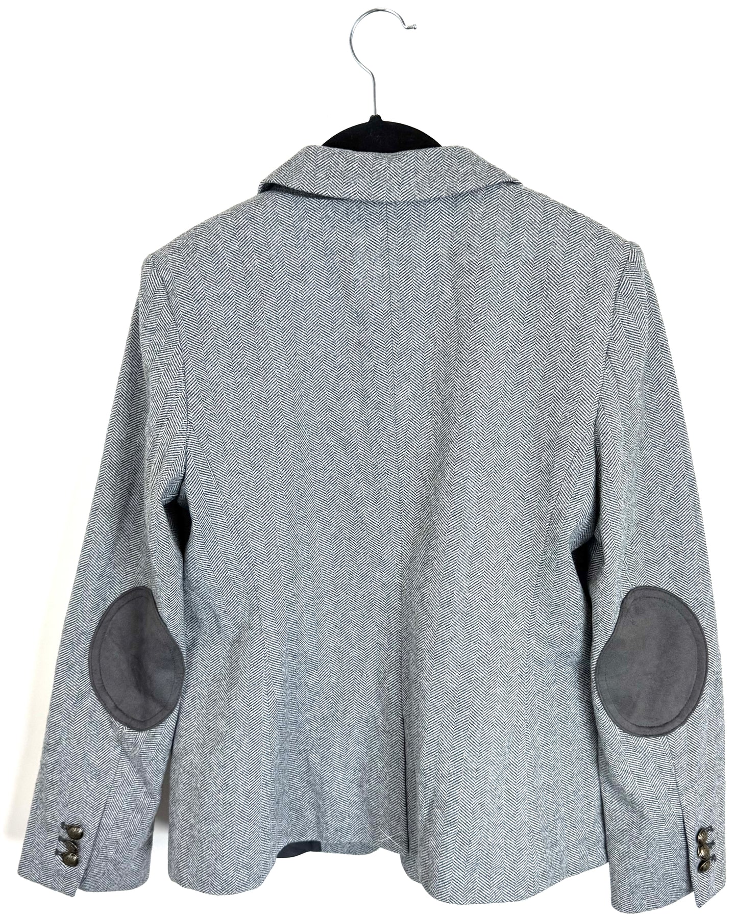 Loft grey and black chevron print blazer in a fuzzy fabric with shoulder pads, grey soft elbow patch, collar, faux front pockets, gold hardware and singular button closure