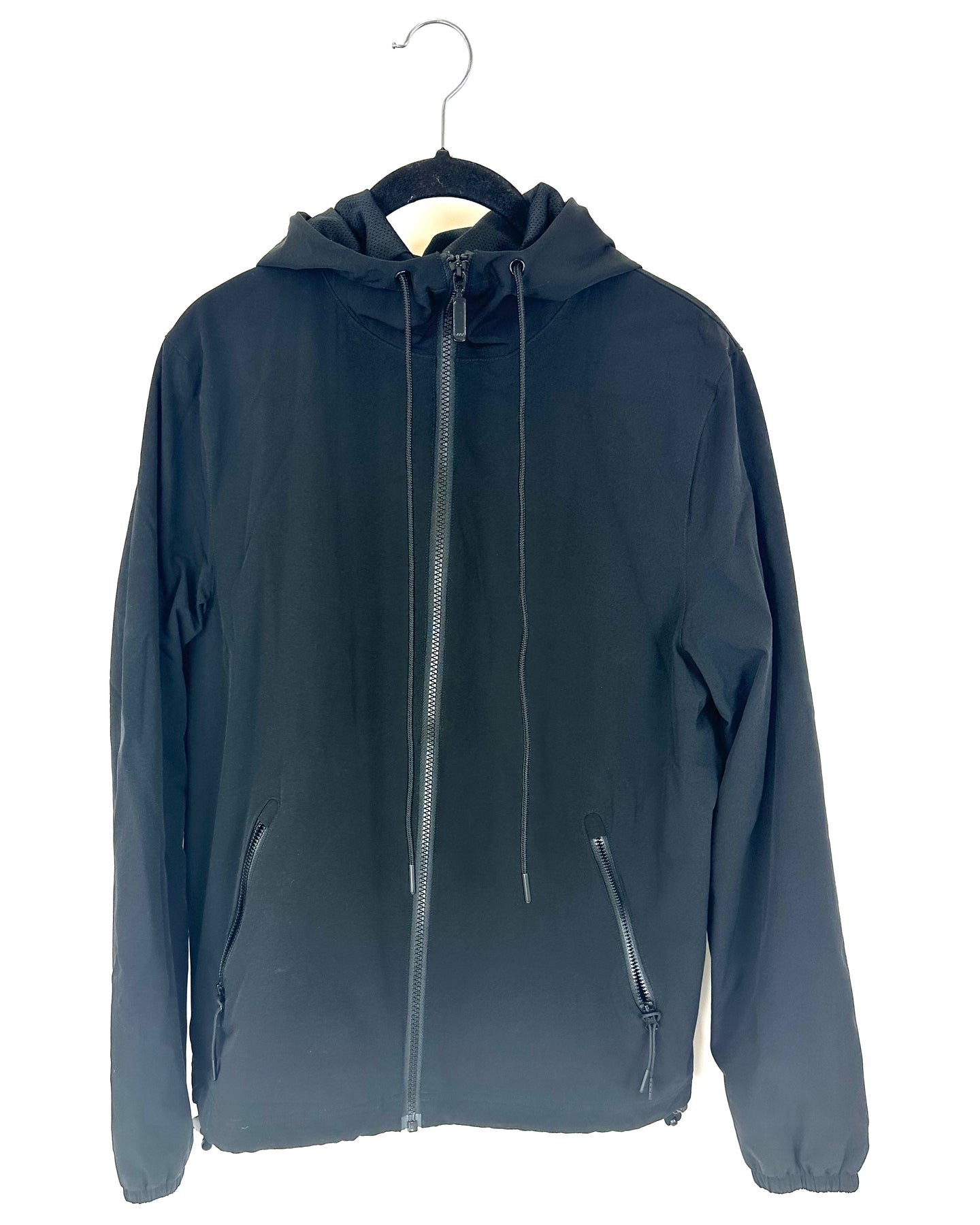 Made for Italic black athletic windbreaker type jacket with front zipper closure, hood, and zipper pockets