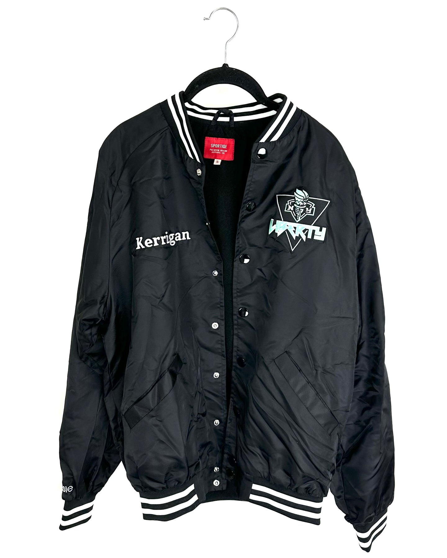 Sportiqe black New York Liberty bomber jacket with snap button closures and embroidered "Kerrigan" on the chest and embroidered "essie" on the sleeve, two pockets, and fleece inner lining.