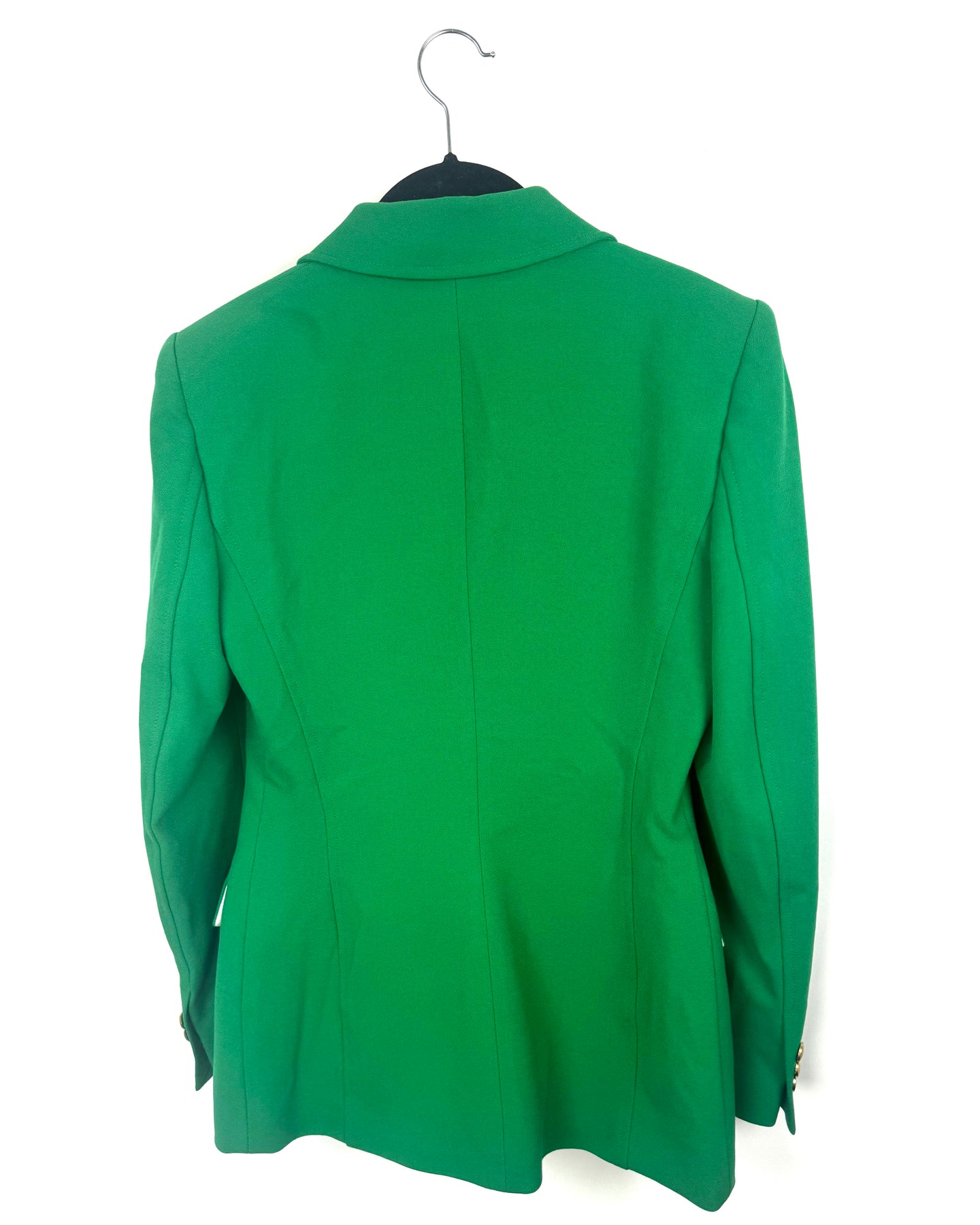 Zara emerald green blazer with shoulder pads, gold-tone buttons, and three flap pockets (two on each side of the bottom of the jacket and one on the top left)