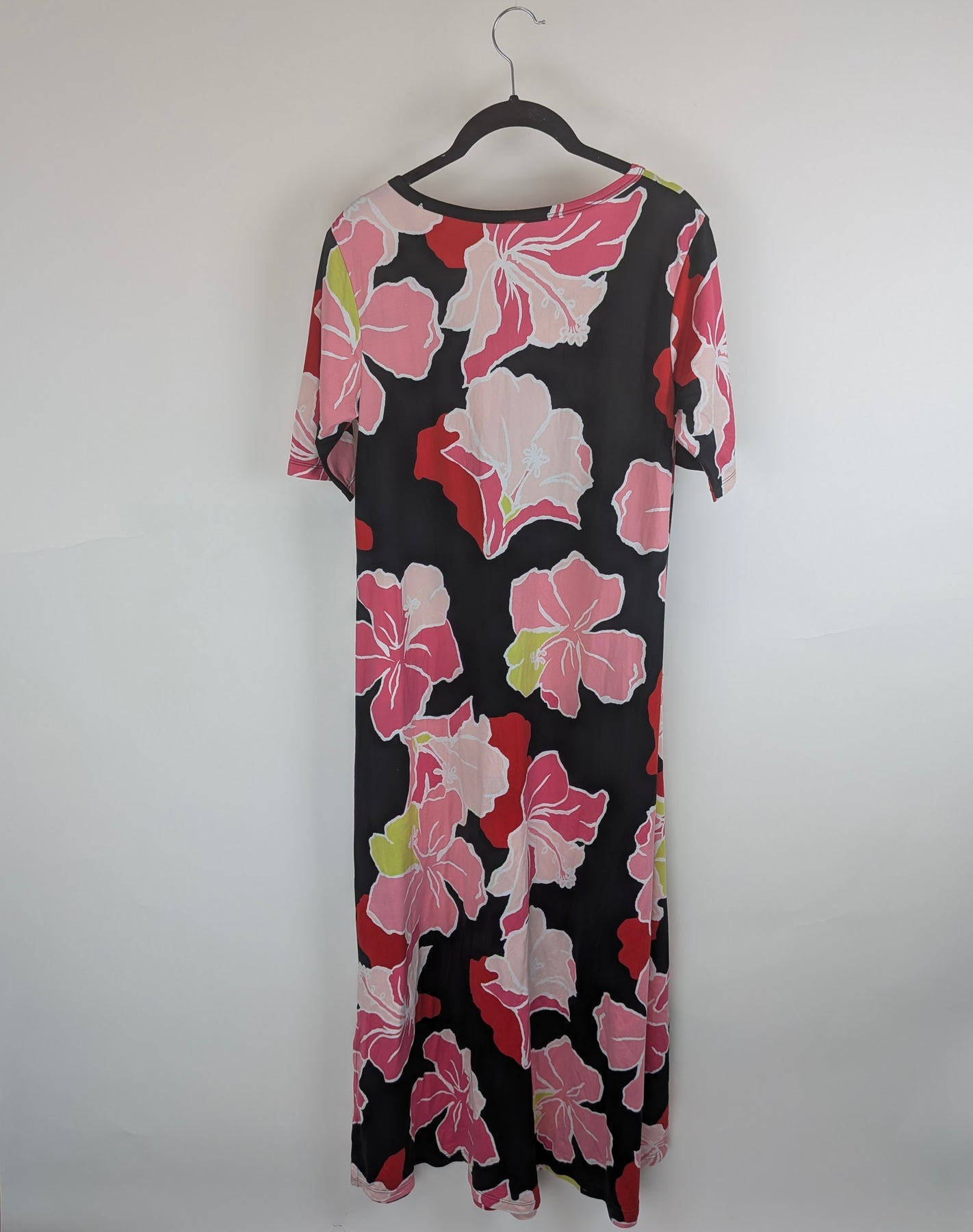 Cuddl Duds black short-sleeve dress with a scoop neckline, a soft, stretchy material, short side slits, and a pink, red, white, and green floral print