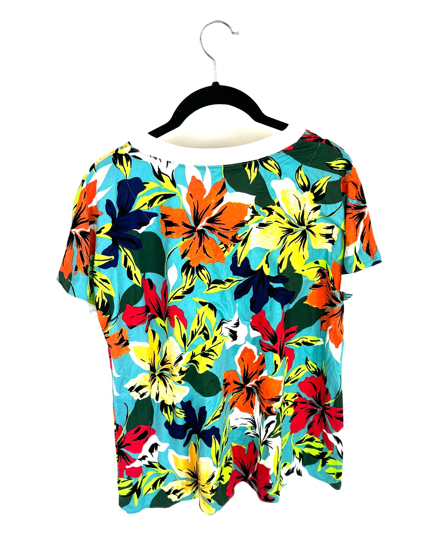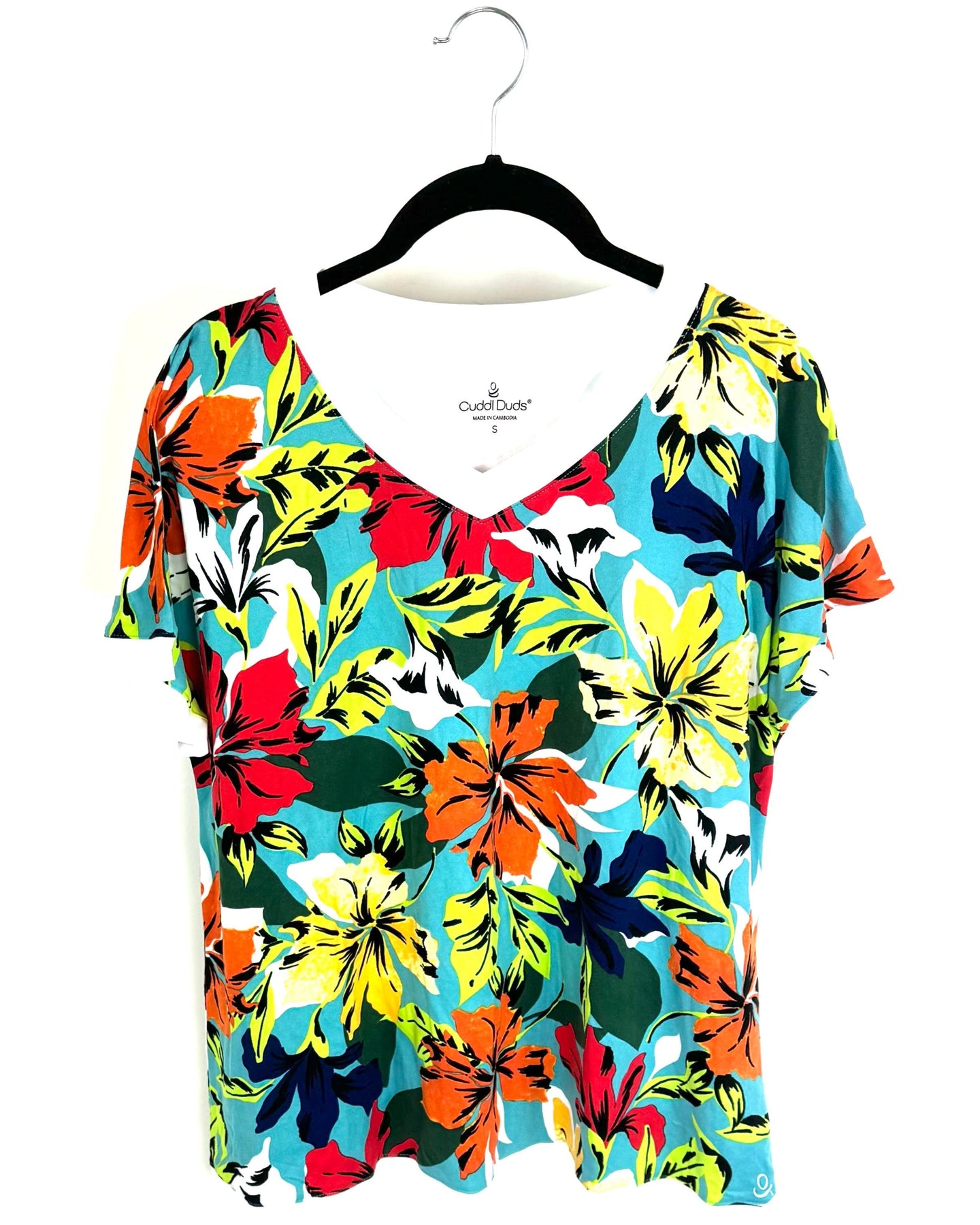 Cuddl Duds bright multi-color floral t-shirt with a v-neckline, short sleeves and white trim in a ultra soft and lightweight fabric