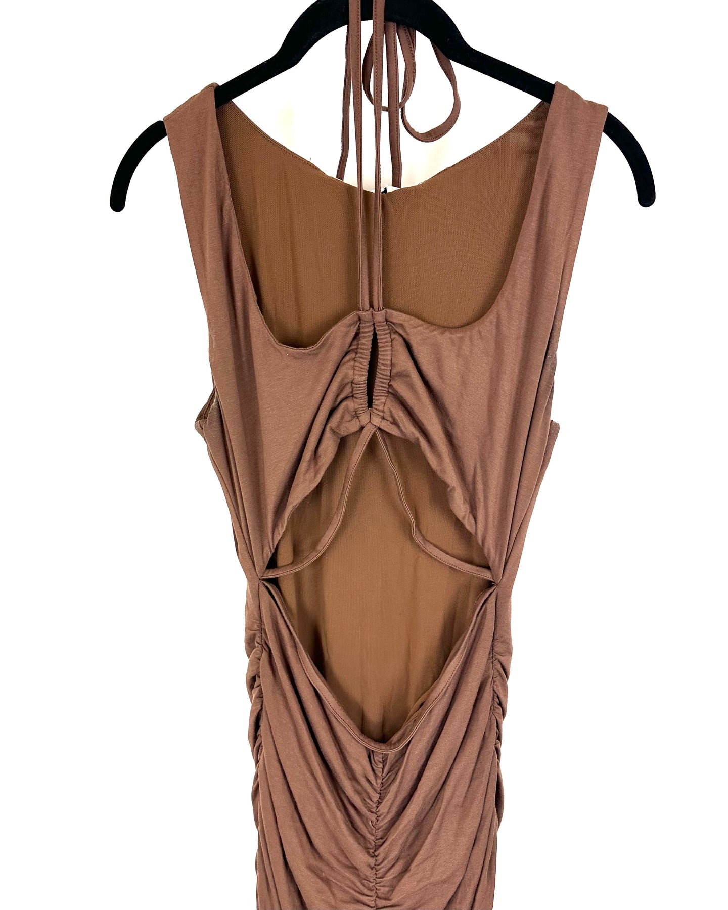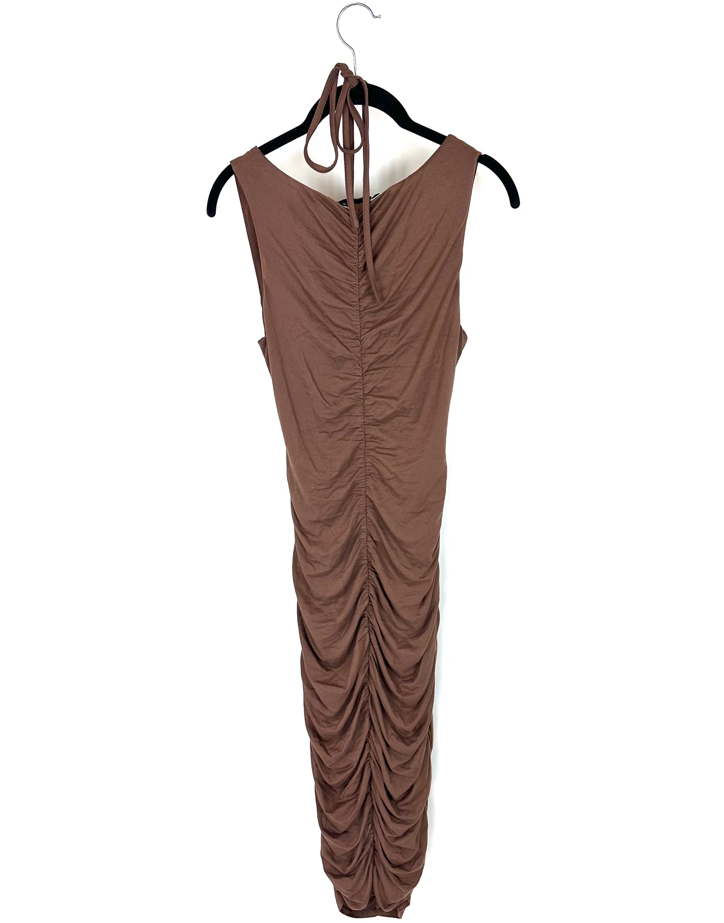 Alana Eve brown, body hugging sleeveless dress with center cutout, drawstring bust and ruched detailing