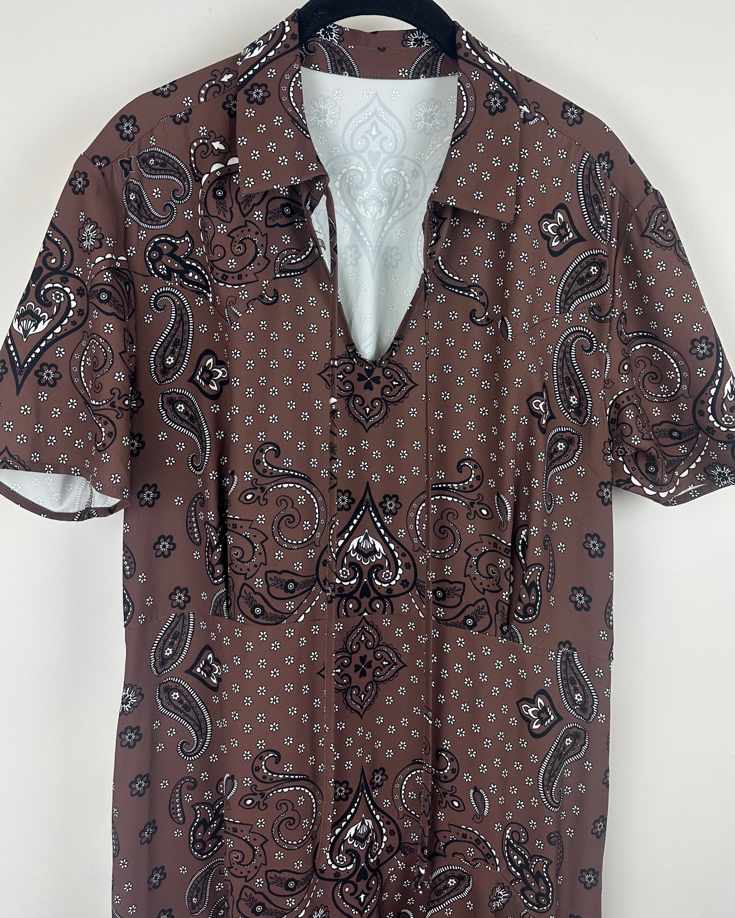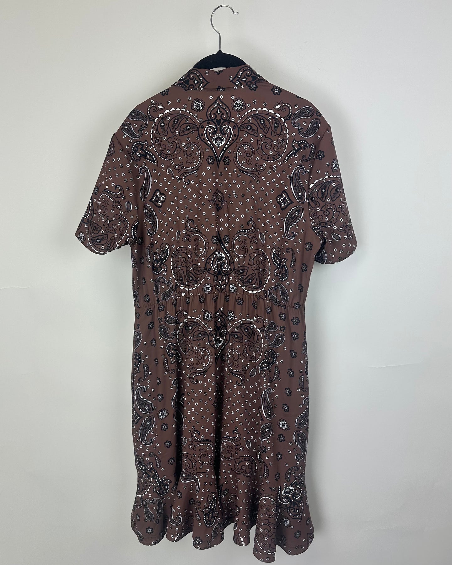 Reunited Clothing, Brown smock dress featuring an allover paisley print, a collared V-neckline with tie detail, short sleeves, side pockets, and ruffle trim along the bottom hem.