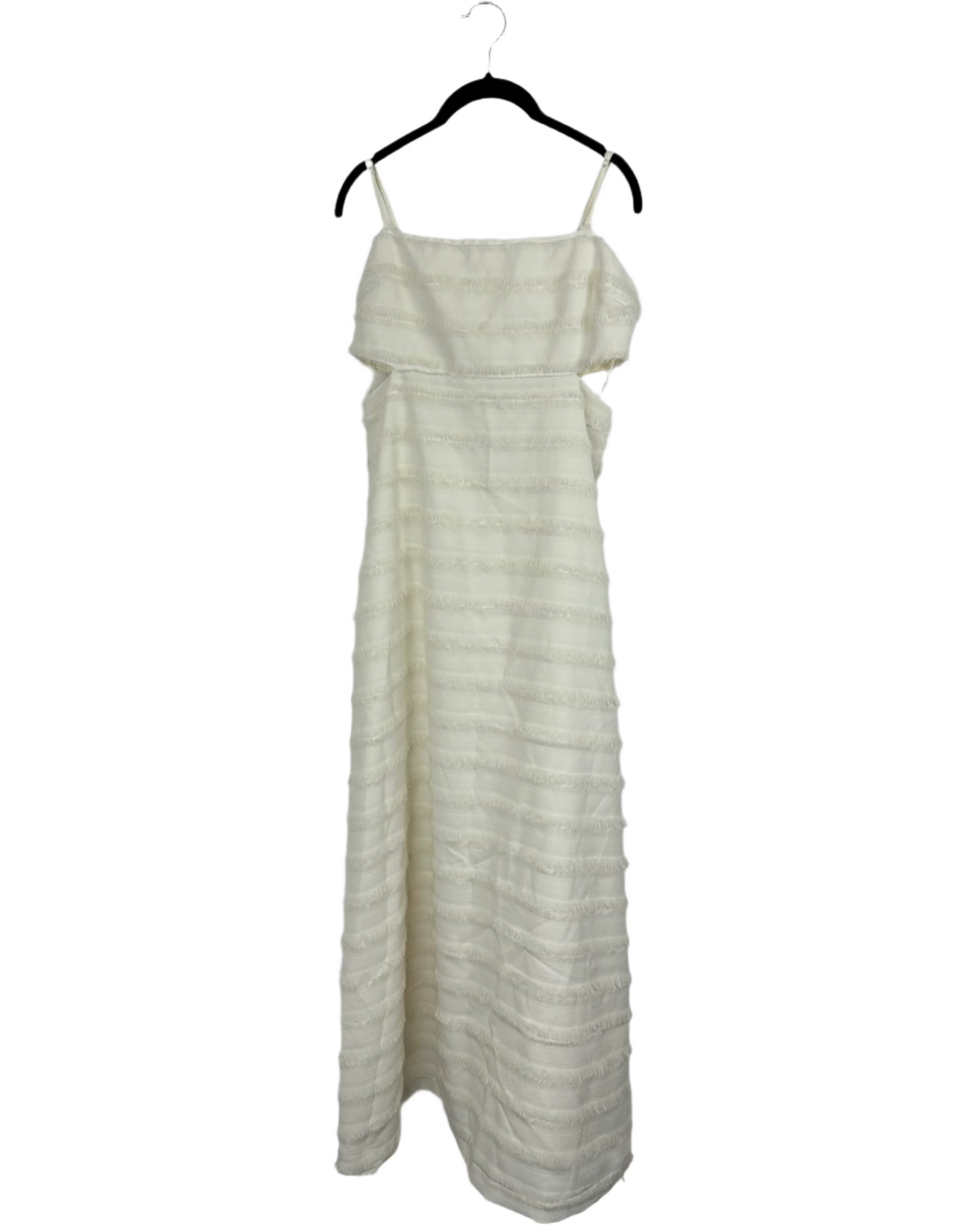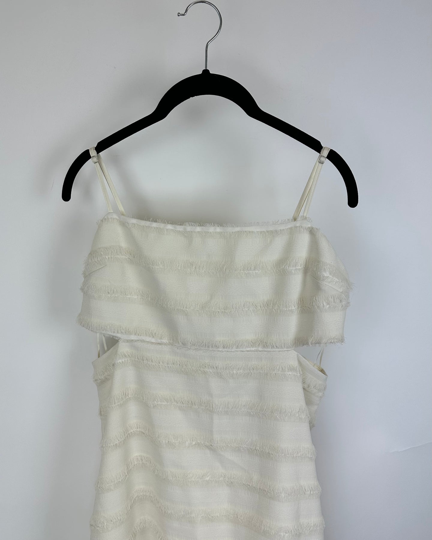 Cami NYC, Cream dress, with a straight neck line, texture stripped line and a fringe stripped line pattern adjustable thin straps, triangle cut outs on both sides under bust area, zipper in the back with a clasp at the top, has a cream slip underneath