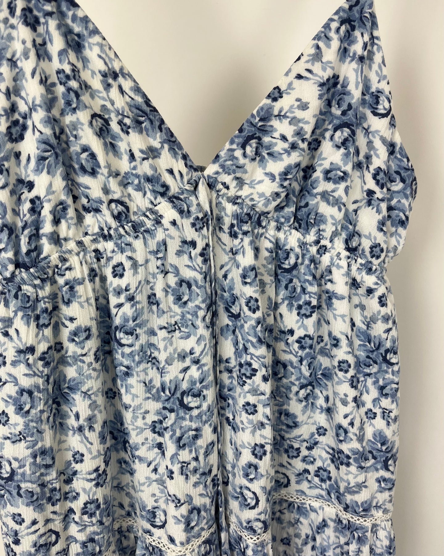 Garage white and blue floral babydoll style mini dress with thin adjustable straps, a smocked back, and a deep v-neckline.