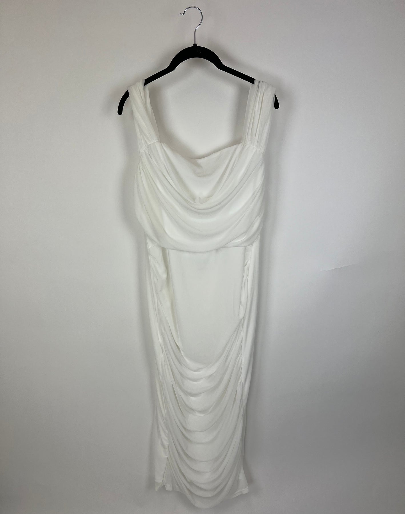 Shein white dress with mesh straps, square neckline, front double lined mesh draping, mesh overlay and side cinch detail in a stretchy fabric