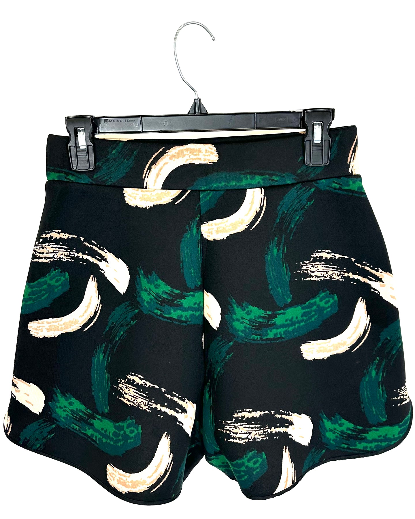 Emily McCarthy black shorts with a gold and tan allover print in a thick scuba fabric with elastic stretch waistband, side pockets with piping, slight side slits and dainty gold emblem logo at hem