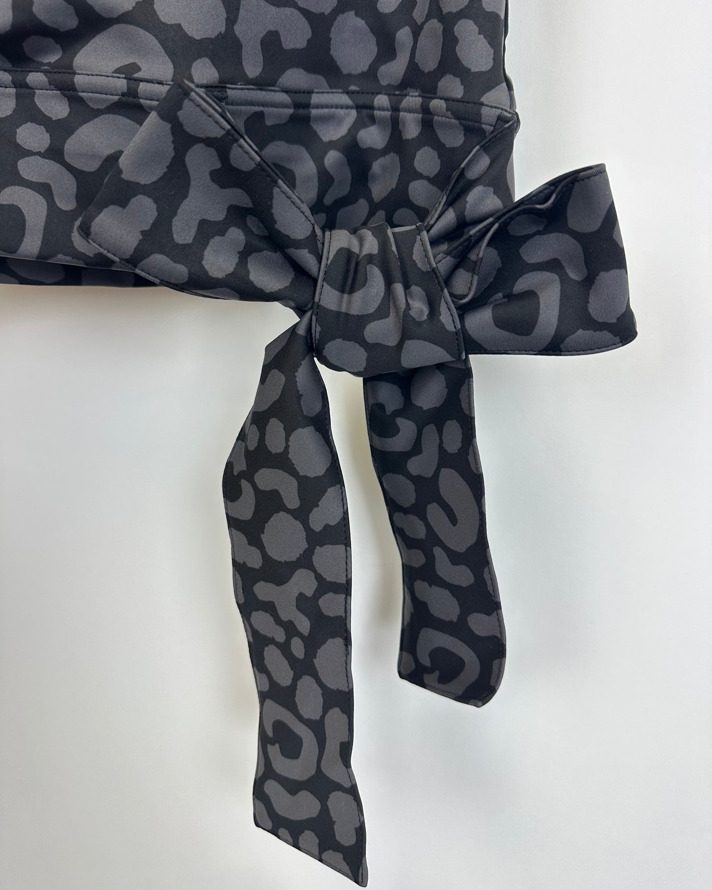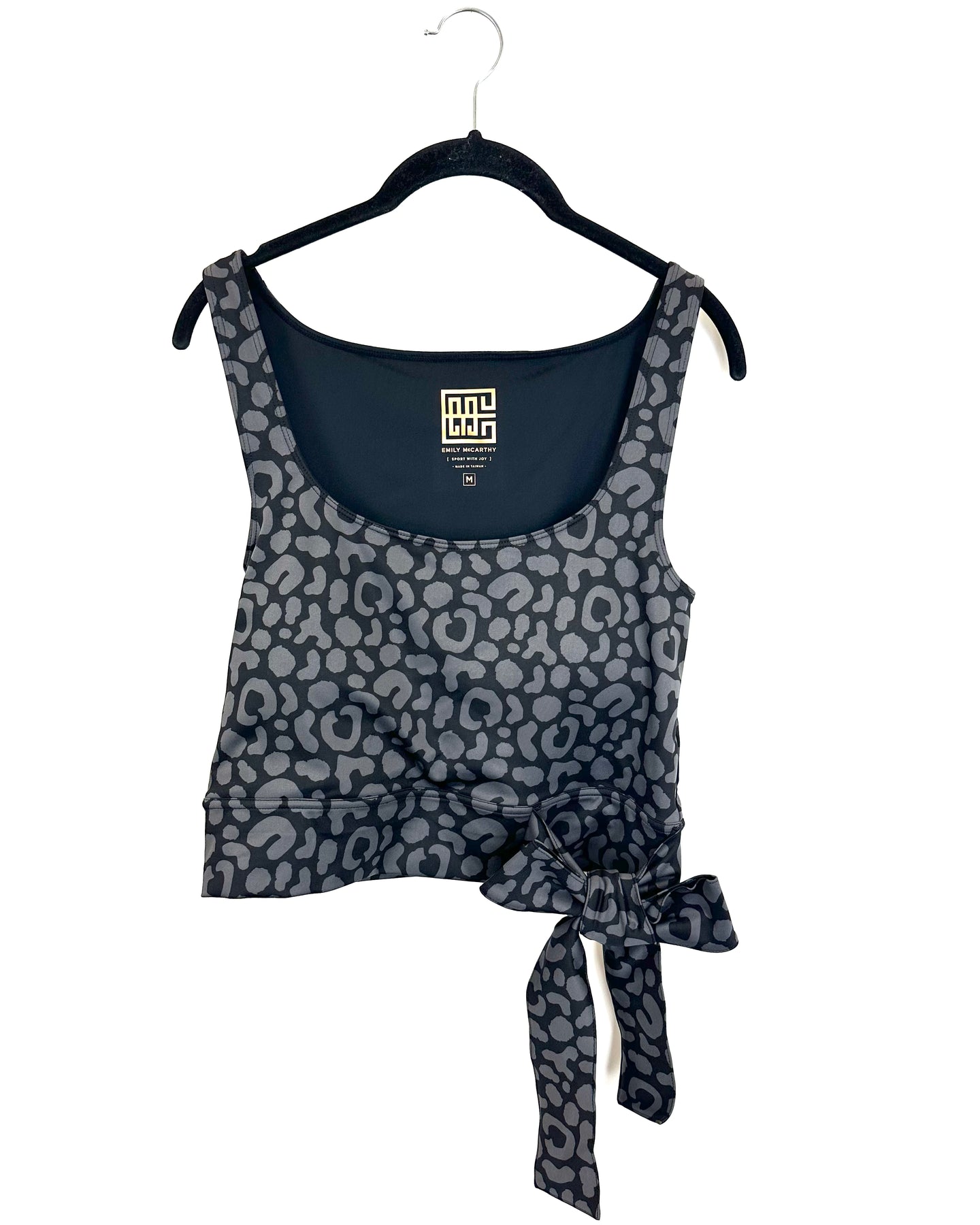 Emily McCarthy black athletic sports bra top with a grey cheetah print, scoop neckline, nonadjustable side bow detail, and removable padding