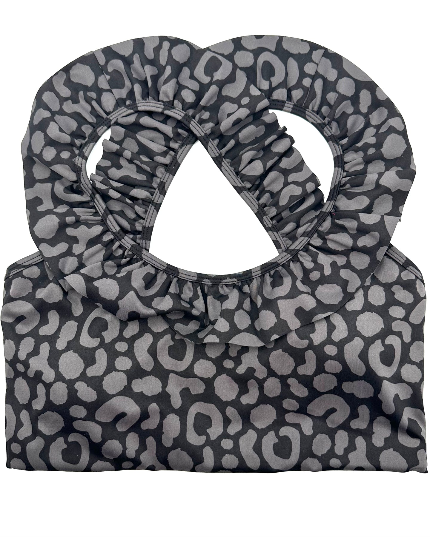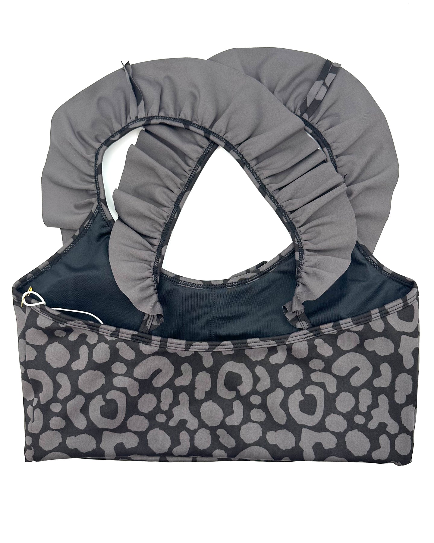 Emily McCarthy black sports bra with a grey cheetah print, ruffle neckline and strap, criss cross thin straps, elastic stretch band and removable padding
