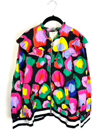 Emily McCarthy black lightweight windbreaker jacket in a bright colorful abstract cheetah print with gold zipper front, pockets, elastic black and white trim and puff statement sleeves with ruffle shoulder