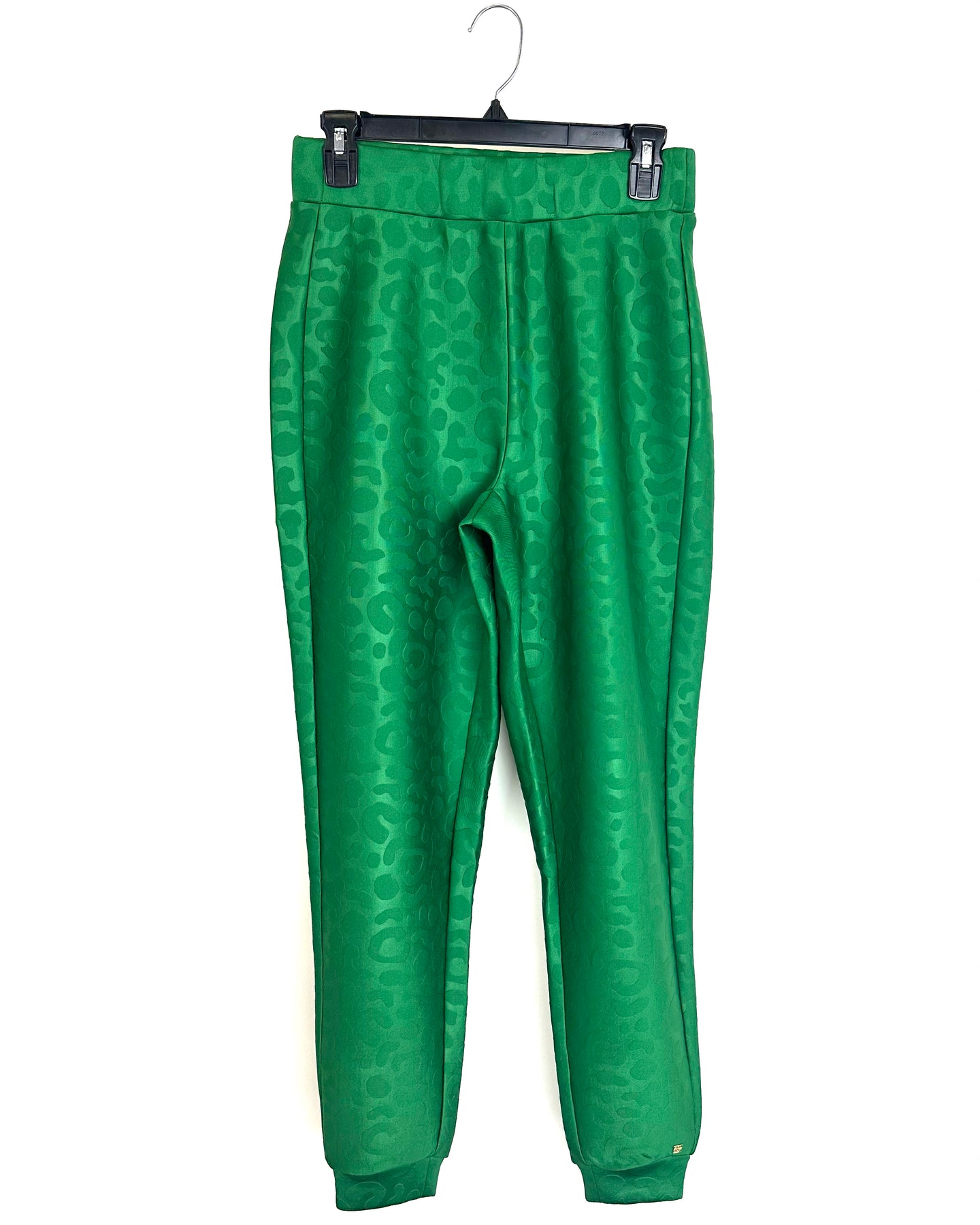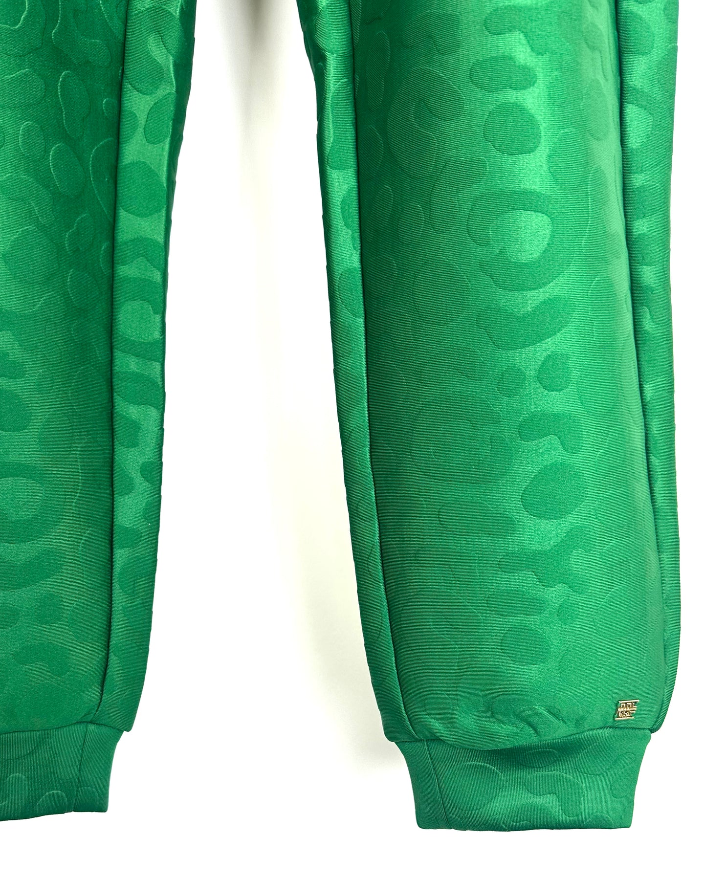 Emily McCarthy green cheetah jogger pants in a thick scuba fabric with elastic stretch waistband, jogger bottom hem and dainty gold emblem logo at hem