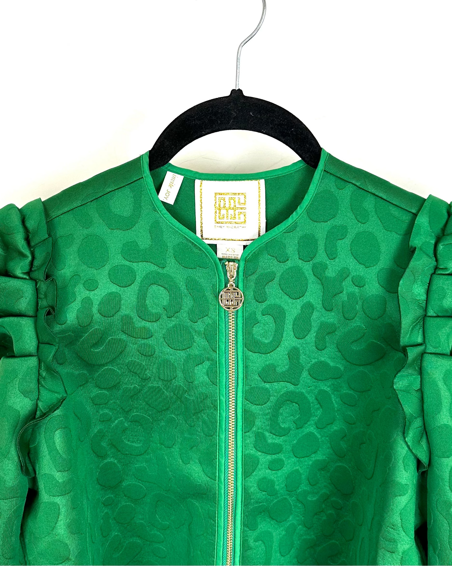 Emily McCarthy green embossed cheetah jacket in a scuba fabric with gold zipper front, puff statement sleeves with ruffle shoulder, long sleeves with gold logo zipper at hem and dainty gold logo on back neck