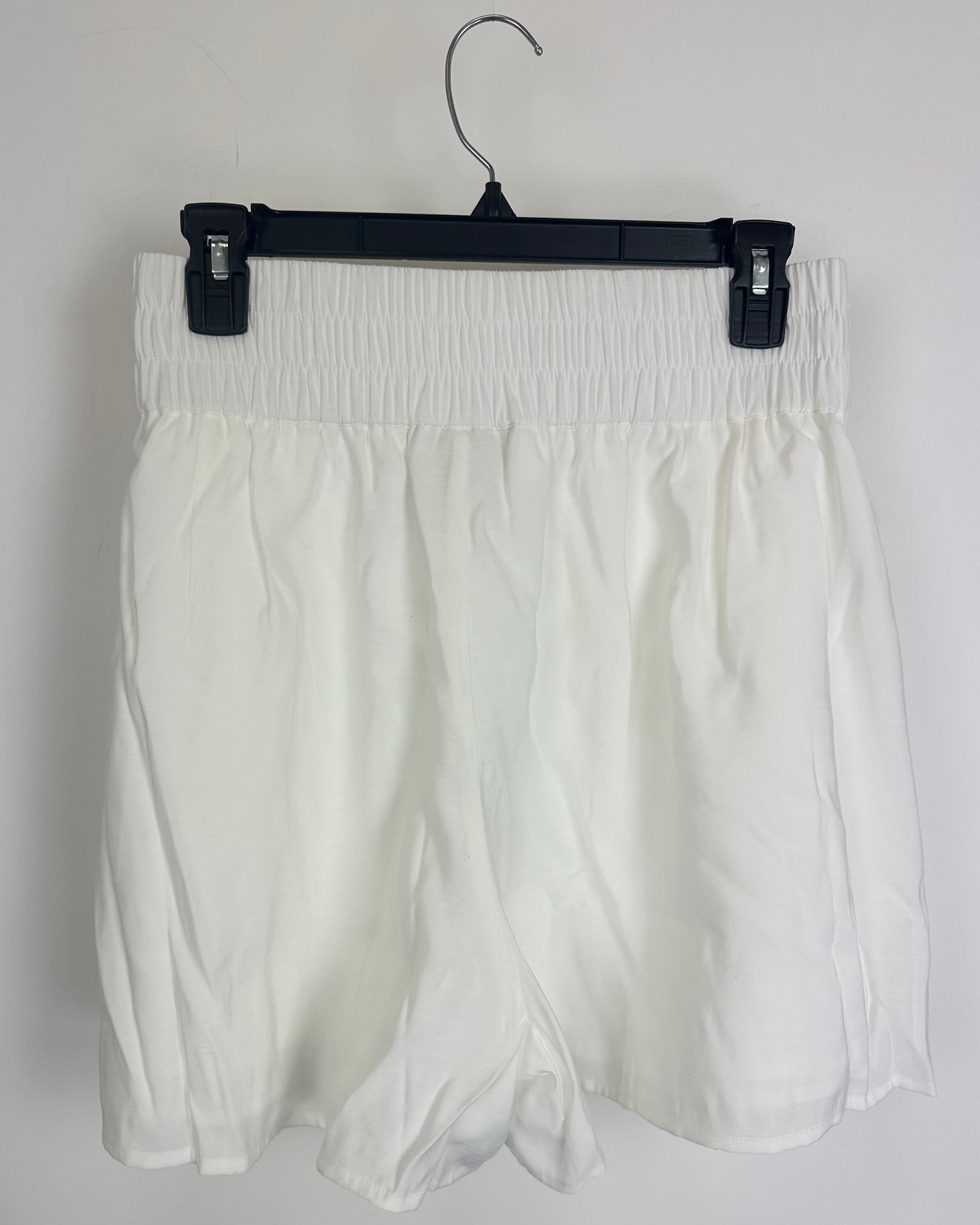 Emily McCarthy white skort in a lightweight and semi sheer fabric with front pleated flowy skirt detail, thick waistband, pockets, back elastic stretch waistband and shorts in the back