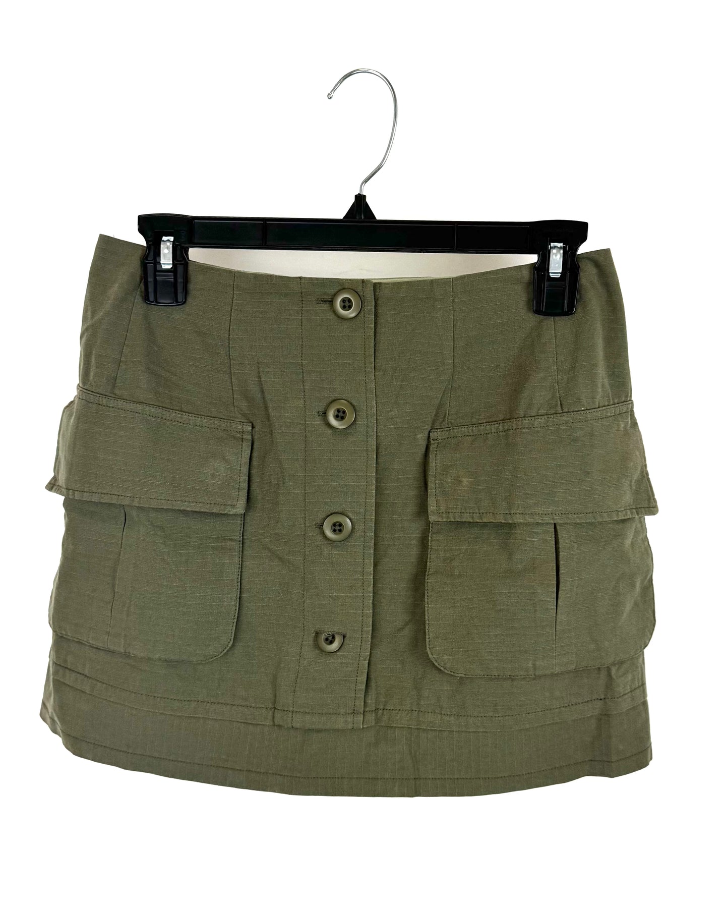 Nicole Miller army green cargo skirt with button closures down center & front flap pockets