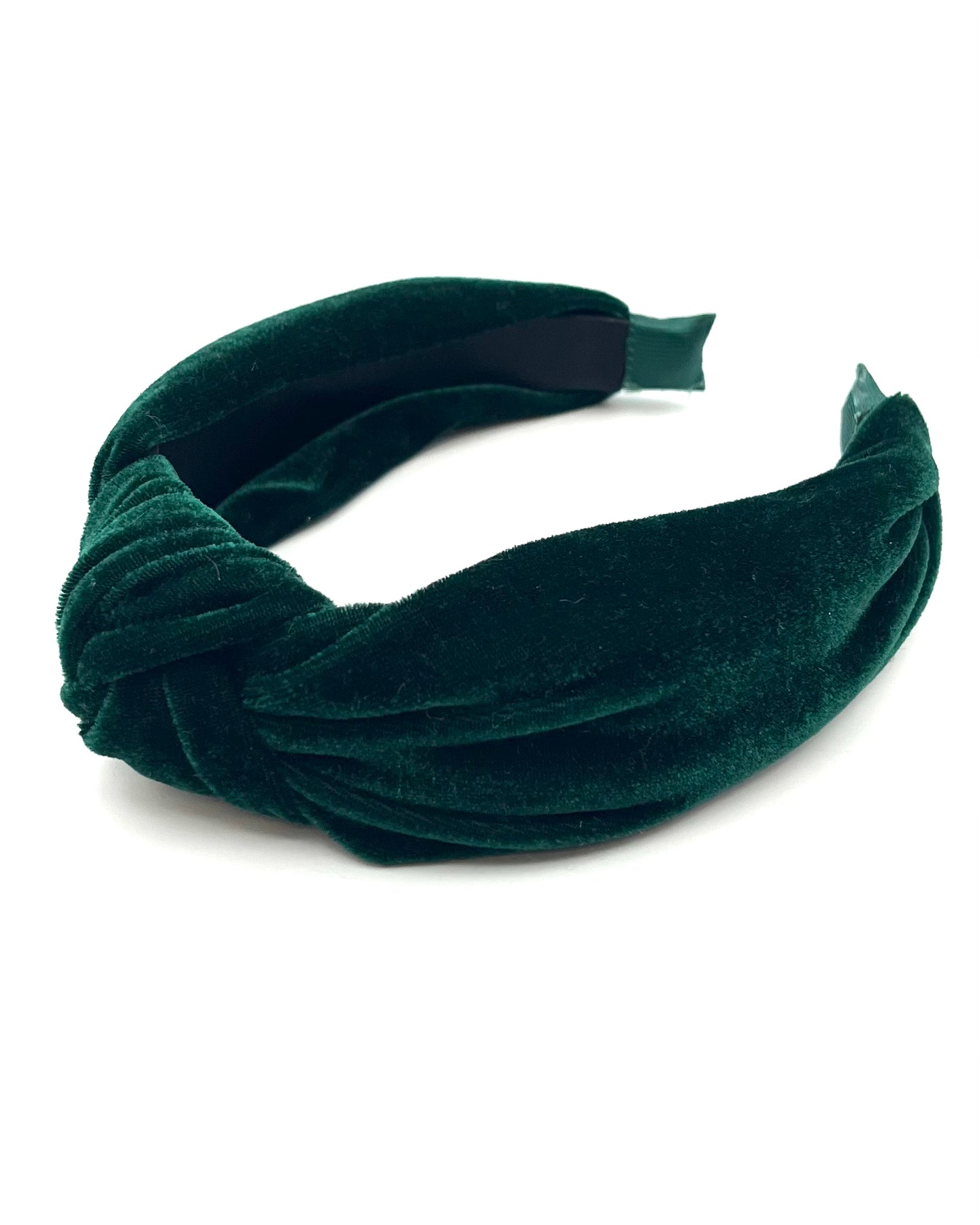 3 pack of green hair accessories including an emerald green velvet headband, ribbed velour bow scrunchie with gold moons and stars and a fuzzy sherpa claw clip