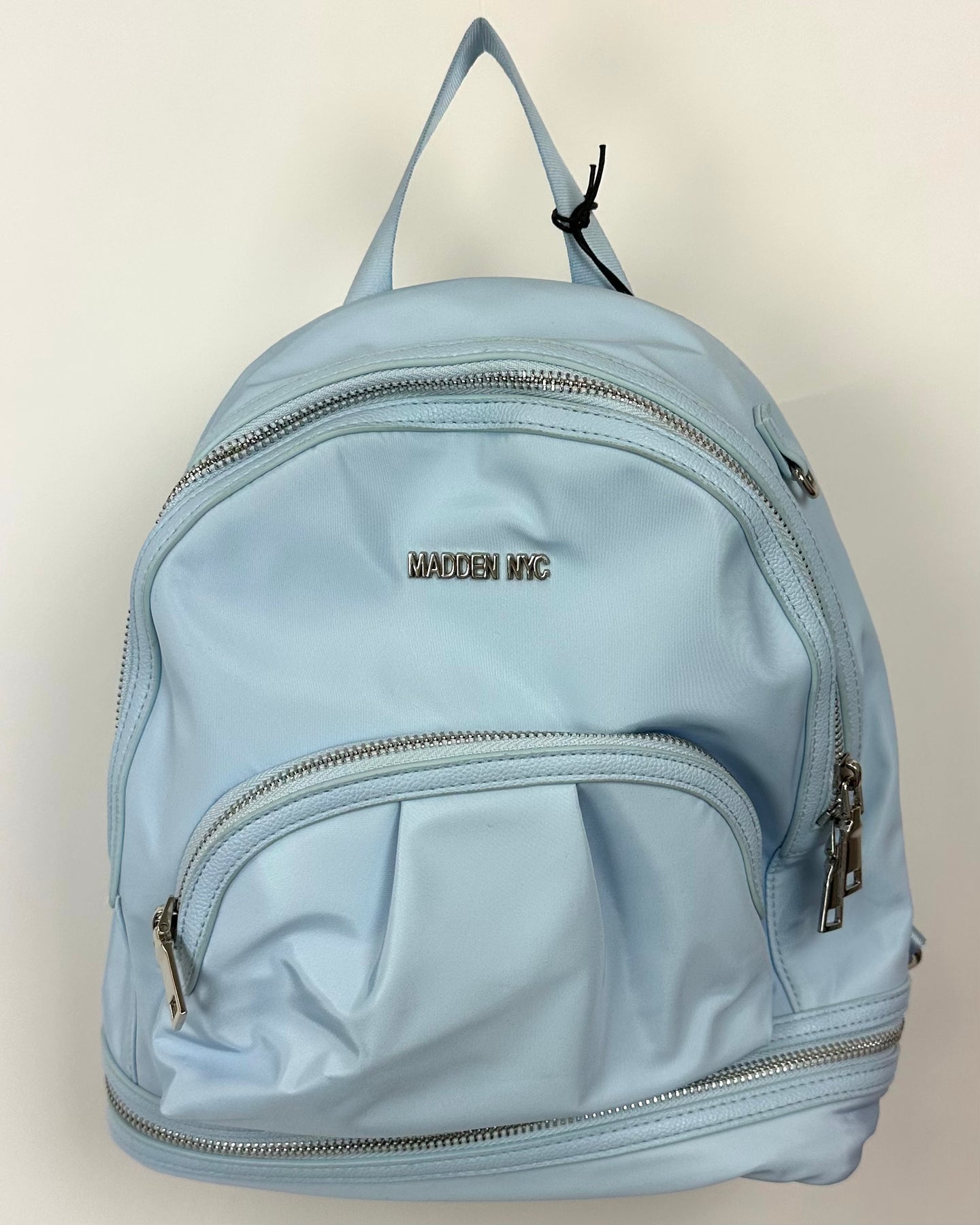 Madden NYC baby blue backpack with adjustable straps with logo and silver hardware with Madden NYC decal on front. Silver zippers on top of backpack, middle compartment, and bottom compartment and blue detachable studded coin purse keychain. Inside features zippered slip pocket and 2 slip pockets on opposite side