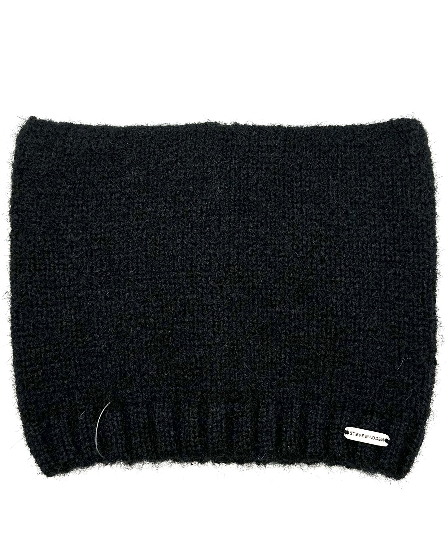 Steve Madden beanie with silver logo plate on the front right, slight cat ear detailing on the top in a soft, black sweater-like material.