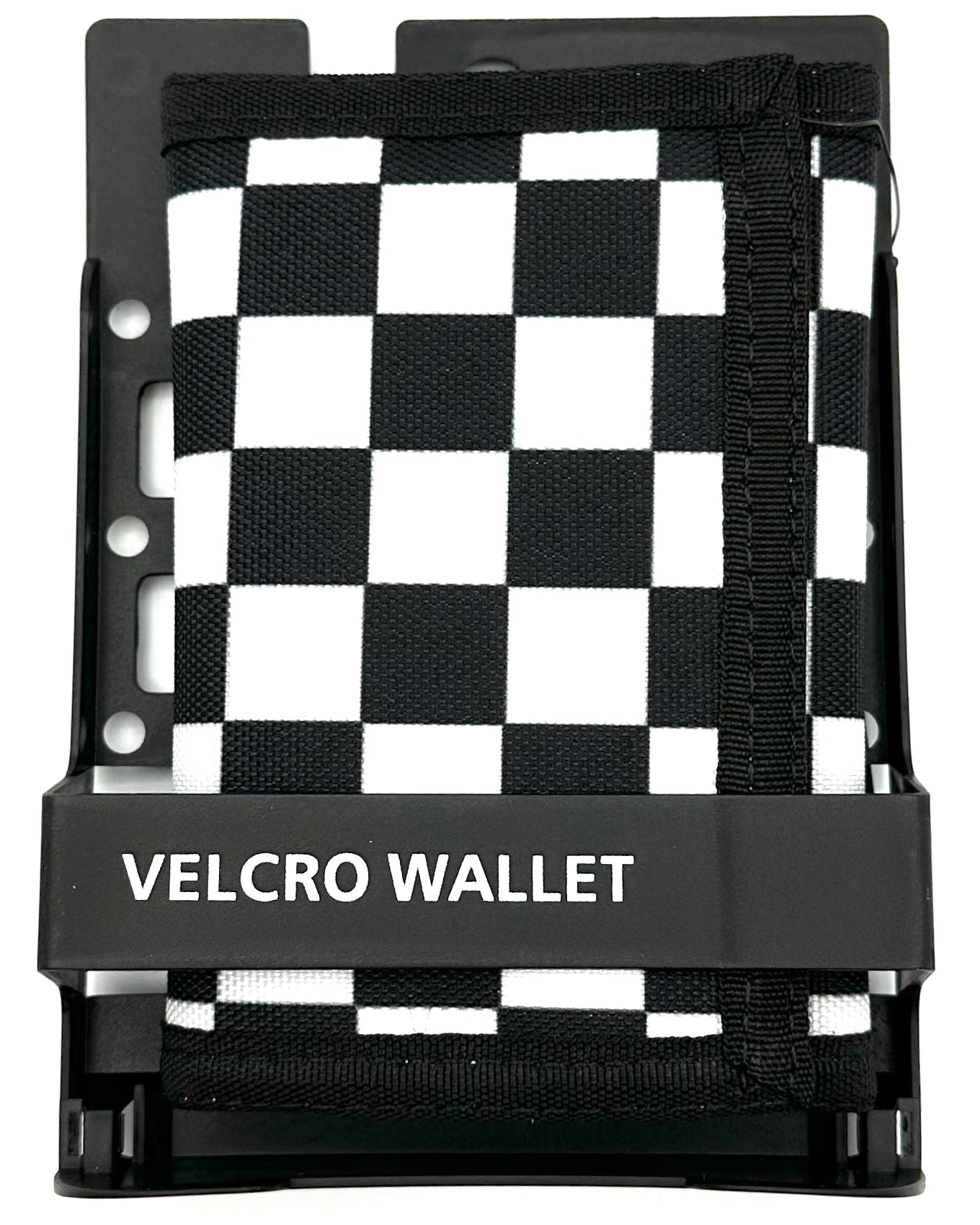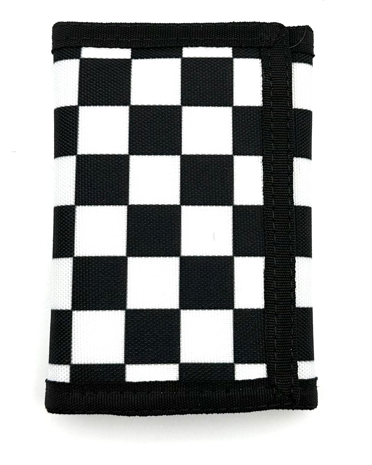 No Boundaries wallet with velcro closure, tri-fold opening, long cash pocket, 3 credit card slots, additional velcro pocket and hook for keychain attachment in a durable, black & white checker pattern fabric.