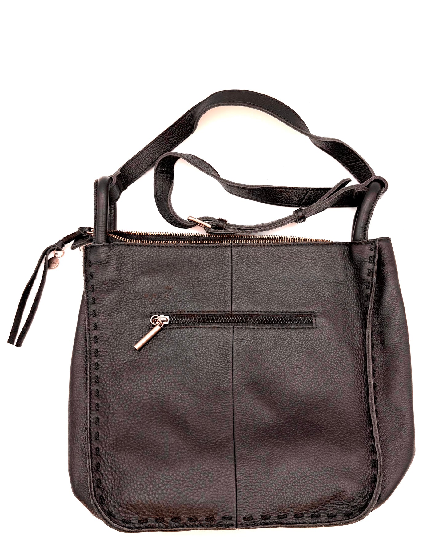 The Sak black leather zipper closure crossbody bag with red, purple, yellow, blue, and pink stitch detail at the front side, leather crossbody strap, zipper pocket at the backside, inside black fabric lining, inside zipper pocket, and two inside open pockets
