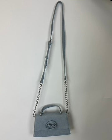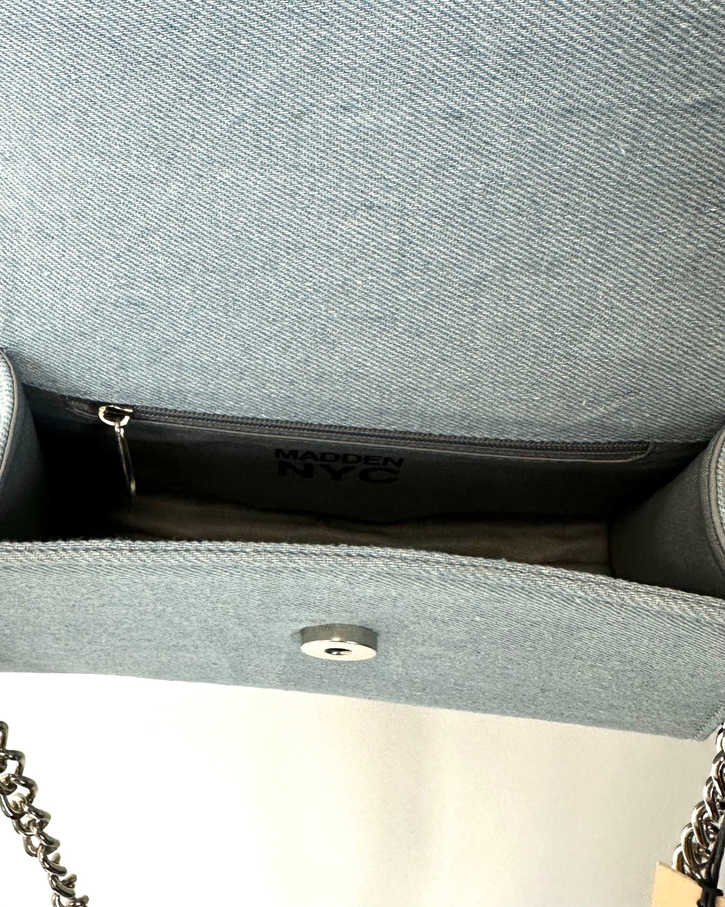 Madden NYC, blue denim bag with top handle and a removable crossbody strap, flap over magnetic snap closure, 3D flower on the front and silver hardware, interior zipper pocket