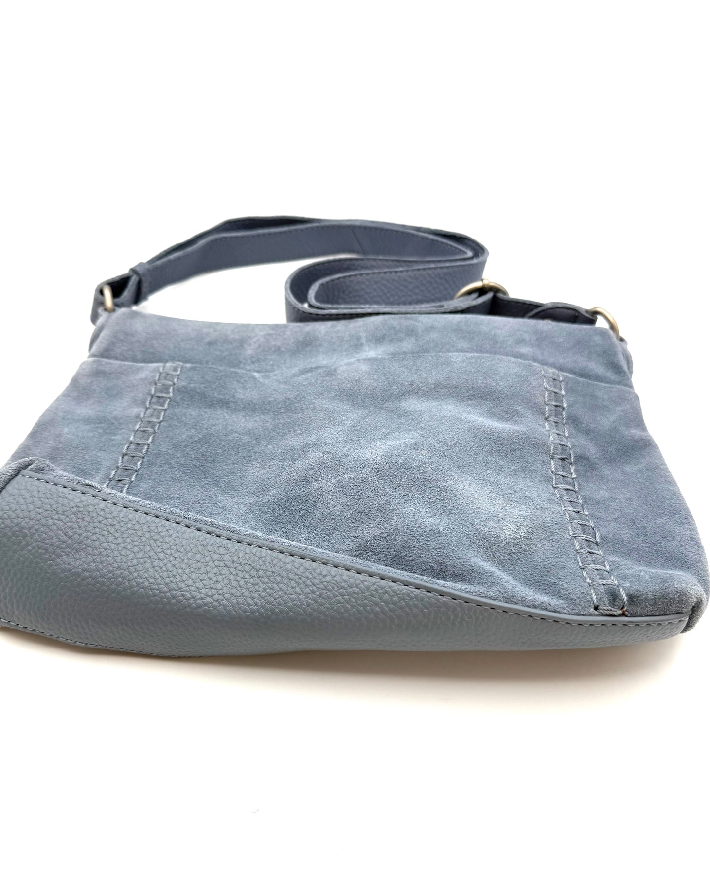 The Sak blue suede crossbody bag with a front zipper pocket, snap closure pocket on the back side, and adjustable pebbled leather crossbody strap with silver hardware