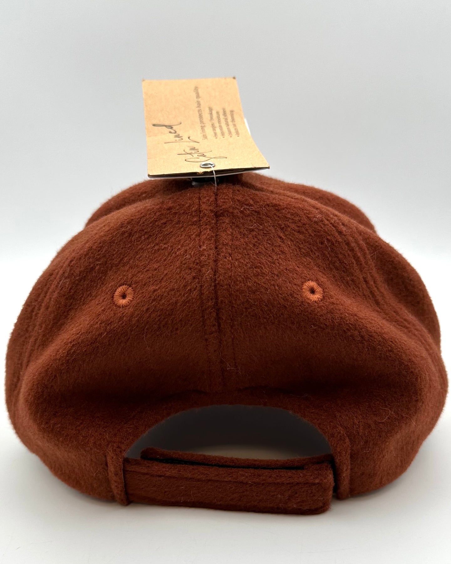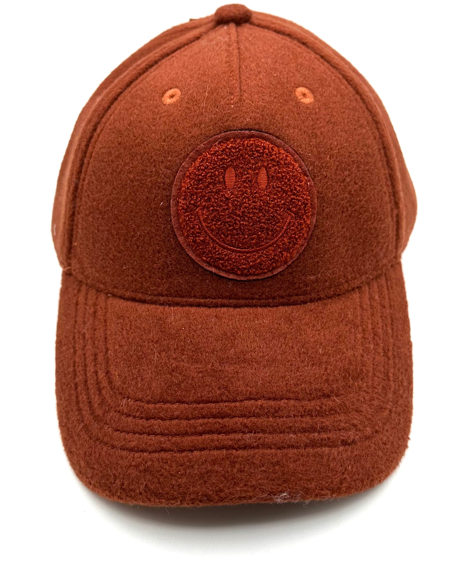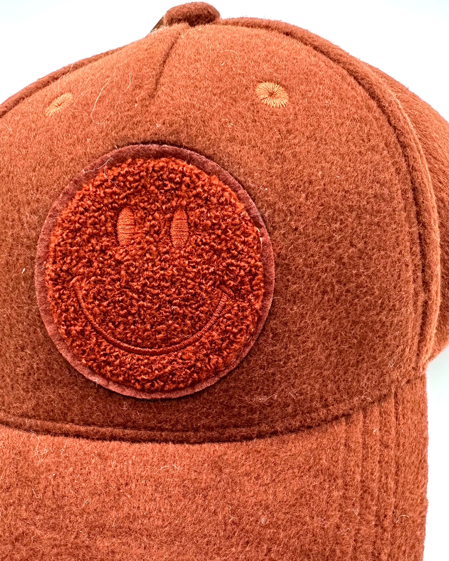 Steve Madden baseball cap with velcro adjuster on the back, lined with satin, monochromatic smiley face patch in the center, in a soft, felt-like burnt orange color.