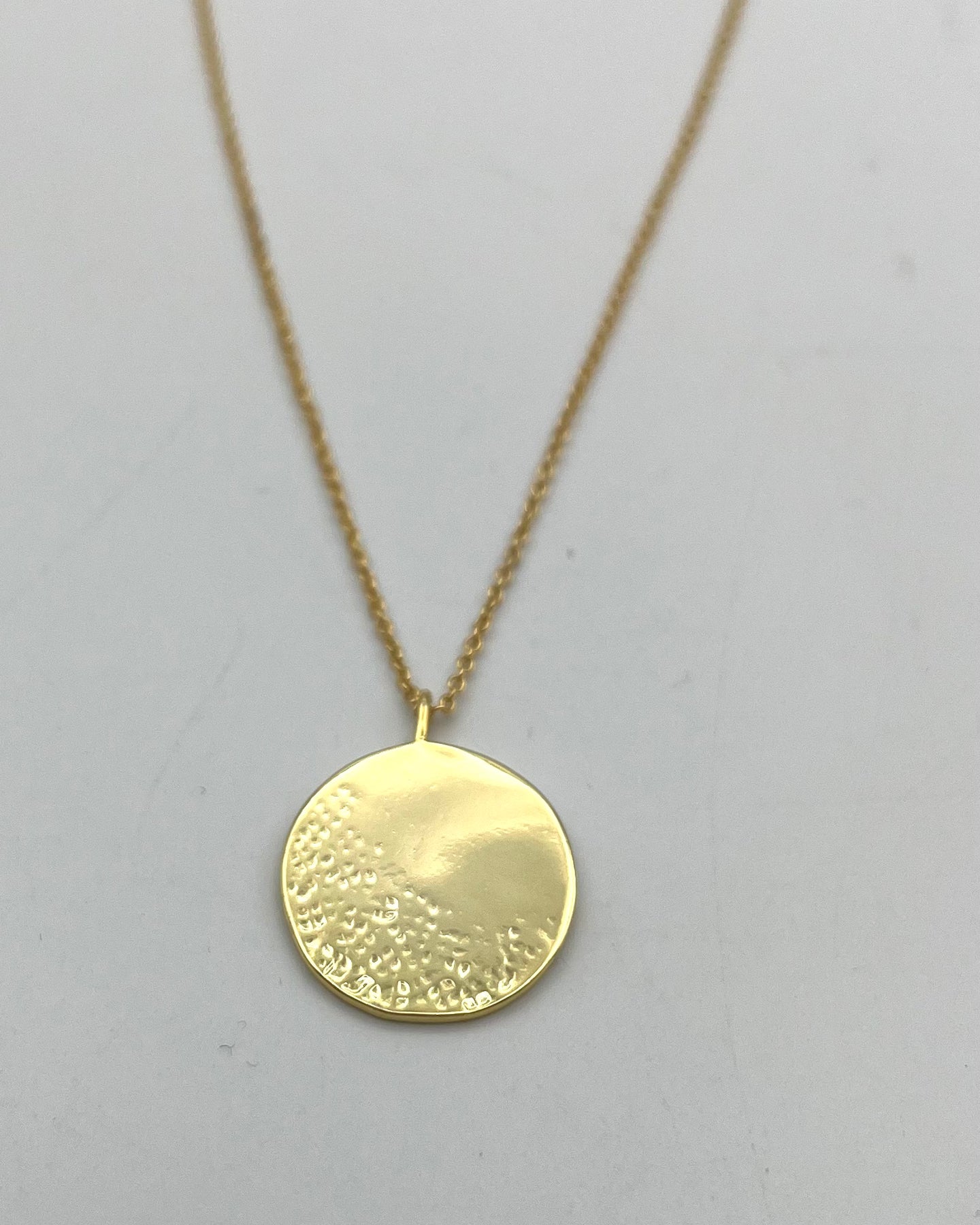 Gorjana dainty gold necklace with flat gold circle with textured detail, clasp closure and signature logo emblem