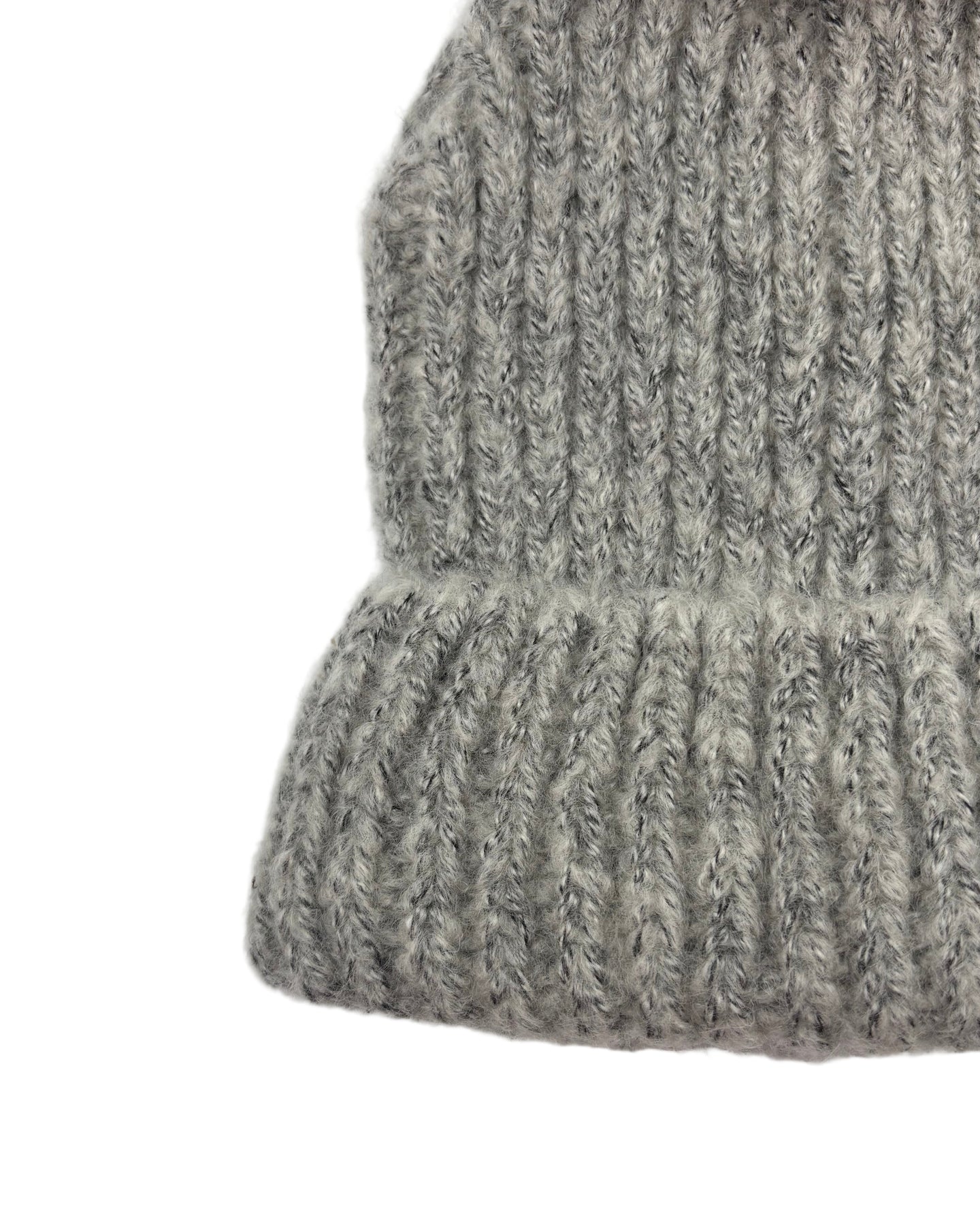 Gray winter hat with a maroon, pink, and white pom pom at the top & fold over detail in a thick, soft sweater-like material.