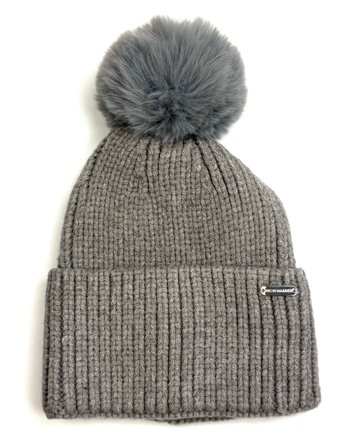 Steve Madden winter hat with fold over detail, silver logo plate on the front right, gray pom-pom at the top in a soft, gray sweater-like fabric.