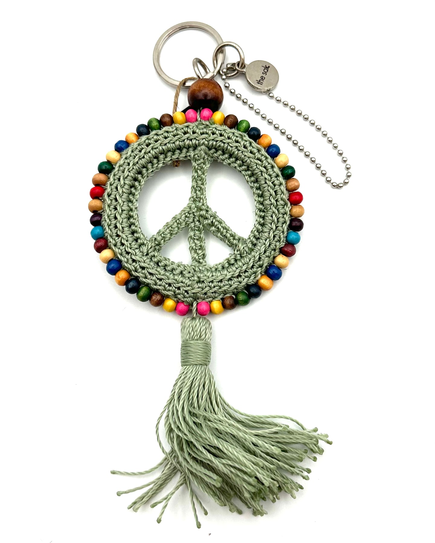 The Sak green crochet peace sign with multicolor beaded outline, green tassel at the bottom, and silver key ring.