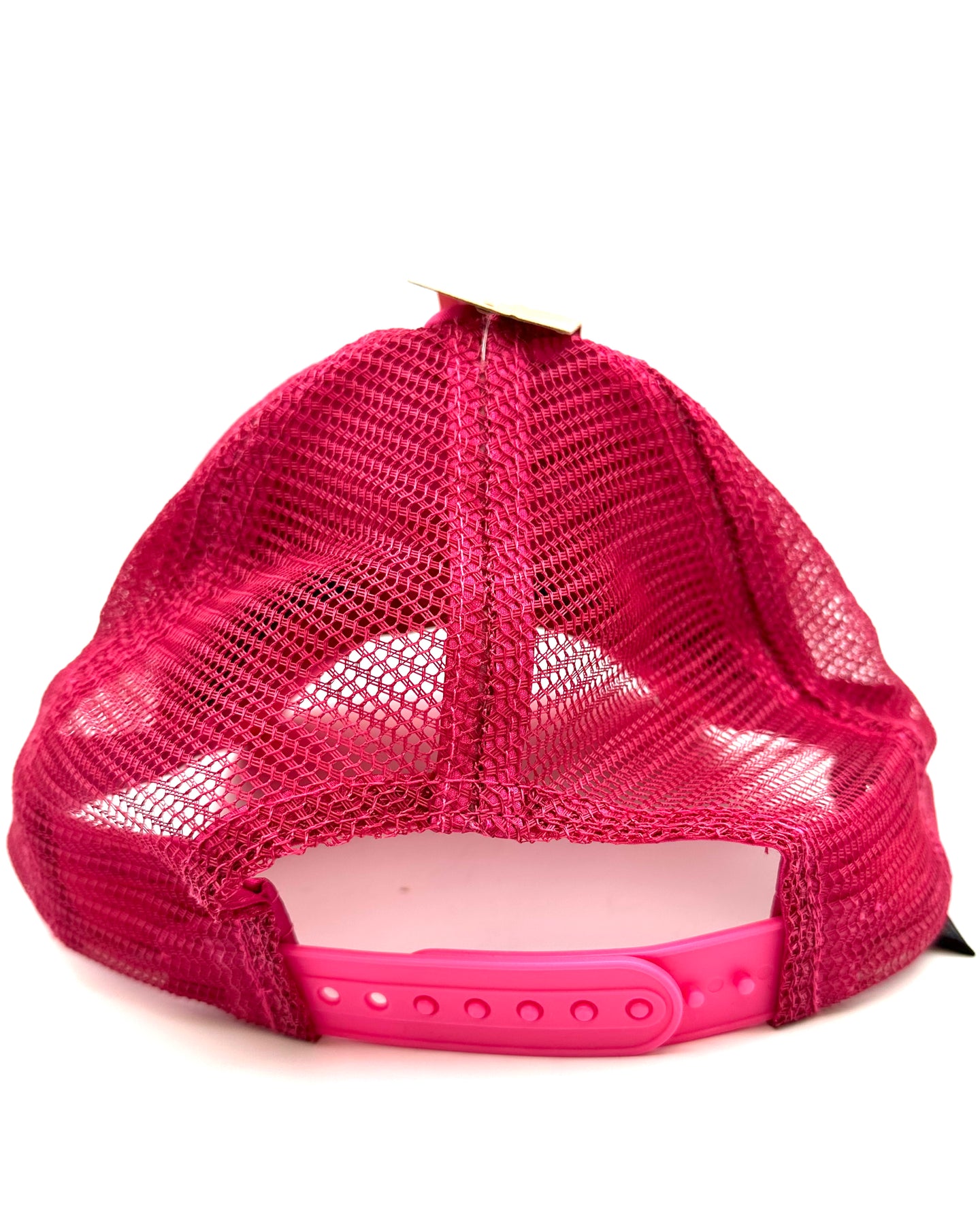 Steve Madden trucker hat with snap adjuster on the back, pink monochromatic smiley face patch in the center, in a half mesh half satin lined, soft pink fabric.